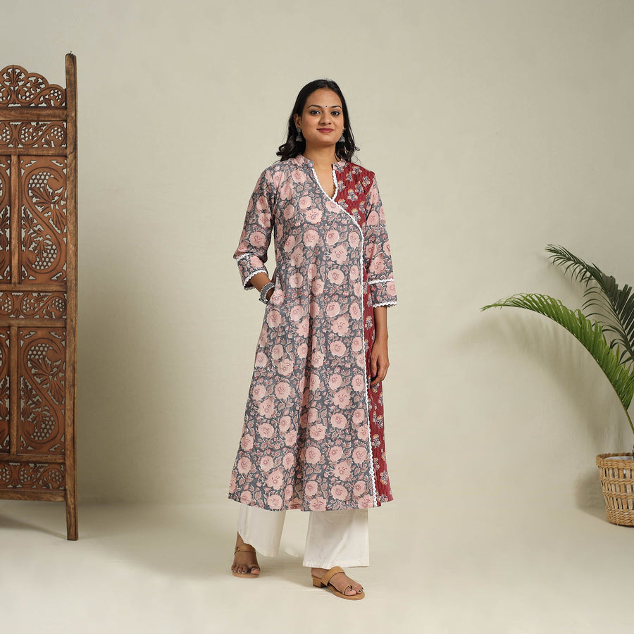 Stay stylish and comfortable with this mosaic fusion A-line grey sanganeri kurta. Crafted from soft cotton and adorned with delicate lace detailing, it also features a practical side pocket for added convenience. The traditional sanganeri block print, known for its intricate floral motifs and vibrant hues, adds a touch of cultural charm. Perfect for festive gatherings or casual days out.