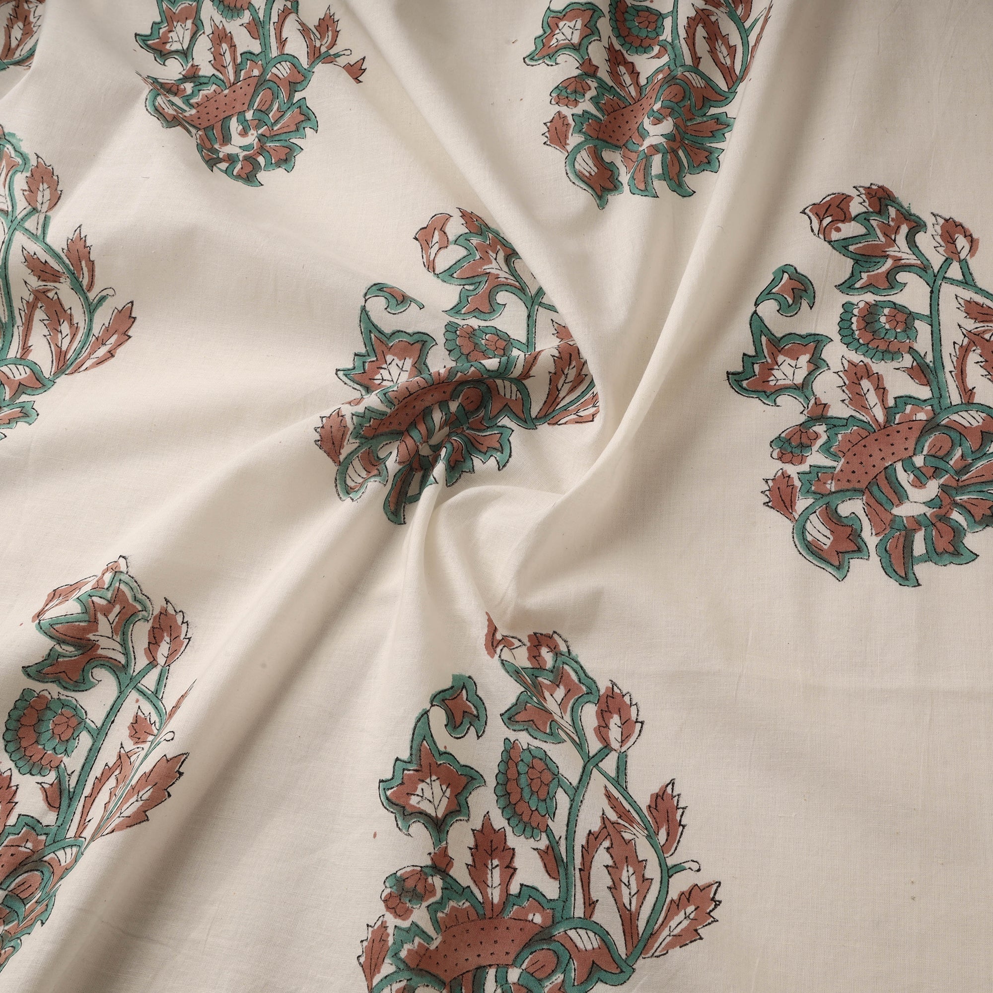 White mughal butta hand block print cotton sanganeri fabric is crafted by skilled artisans in Sanganer, Jaipur, using traditional wooden blocks. The Mughal butta motifs are inspired by floral patterns popular during the Mughal era and are known for their fine detailing. This printing tradition is over 400 years old and has been passed down through generations. Made from lightweight, breathable cotton, the fabric is ideal for kurtas, dresses, tunics and home decor pieces such as cushion covers and curtains.