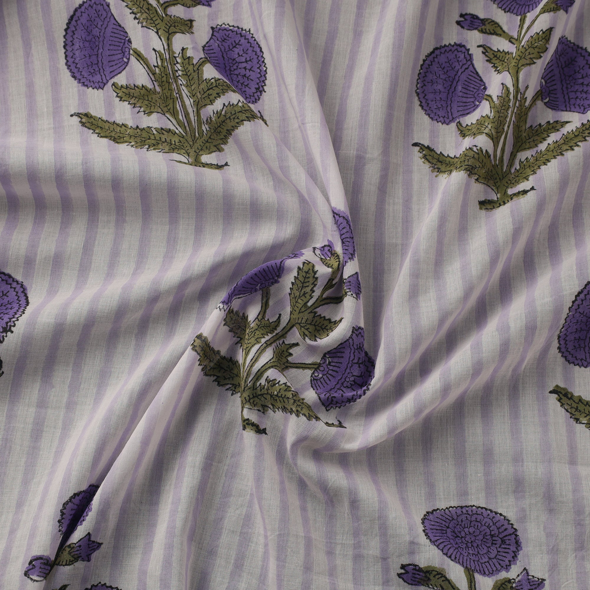 Purple pure mul cotton mughal butta hand block print sanganeri fabric is crafted by skilled artisans in Sanganer, Jaipur, using traditional wooden blocks. The mughal butta motifs are inspired by floral patterns popular during the Mughal era and are known for their fine detailing. This printing tradition is over 500 years old and has been passed down through generations. Made from lightweight, breathable mul cotton, the fabric is ideal for kurtas, dresses, tunics and home decor pieces such as cushion covers and curtains.