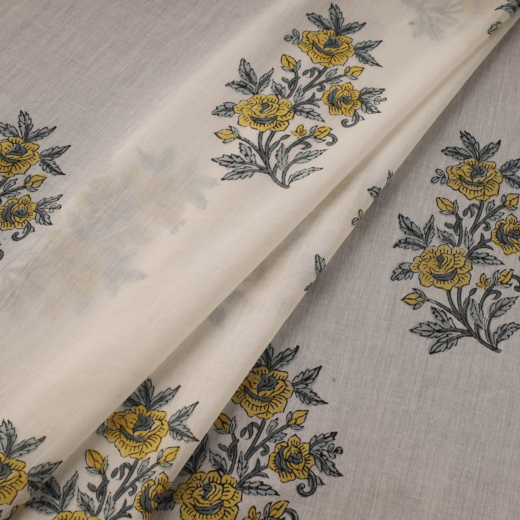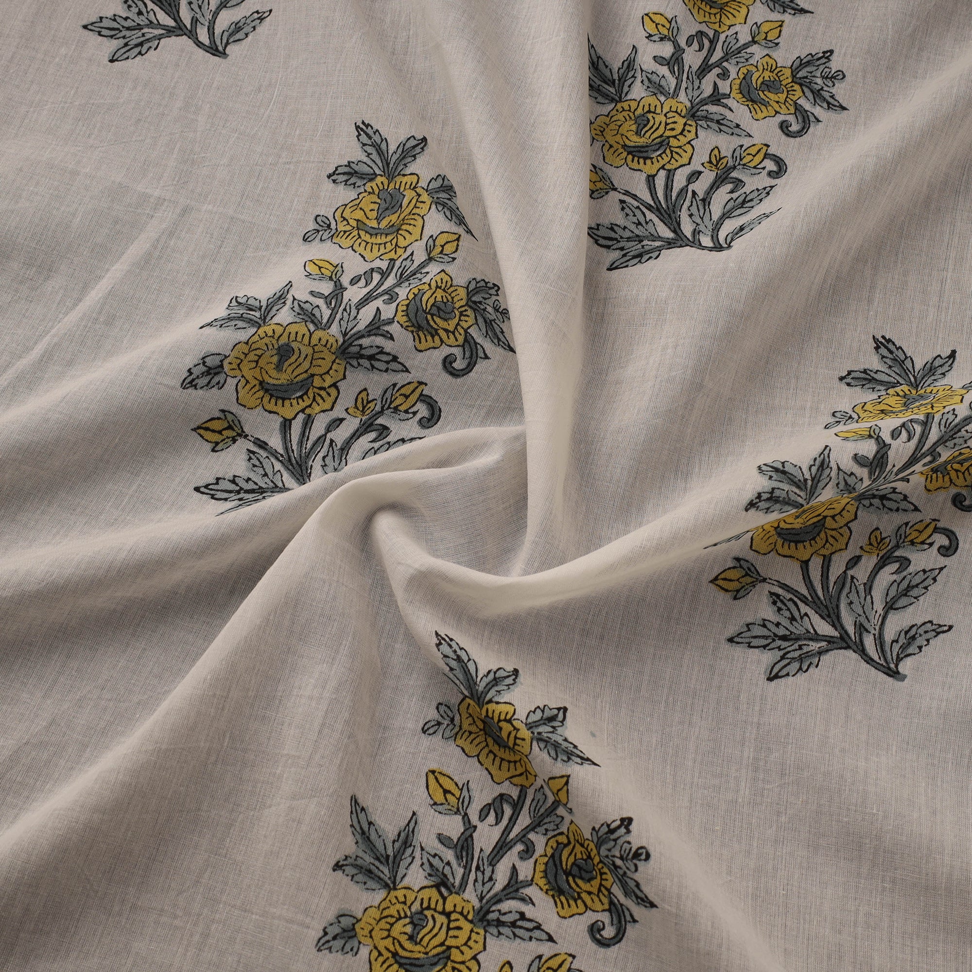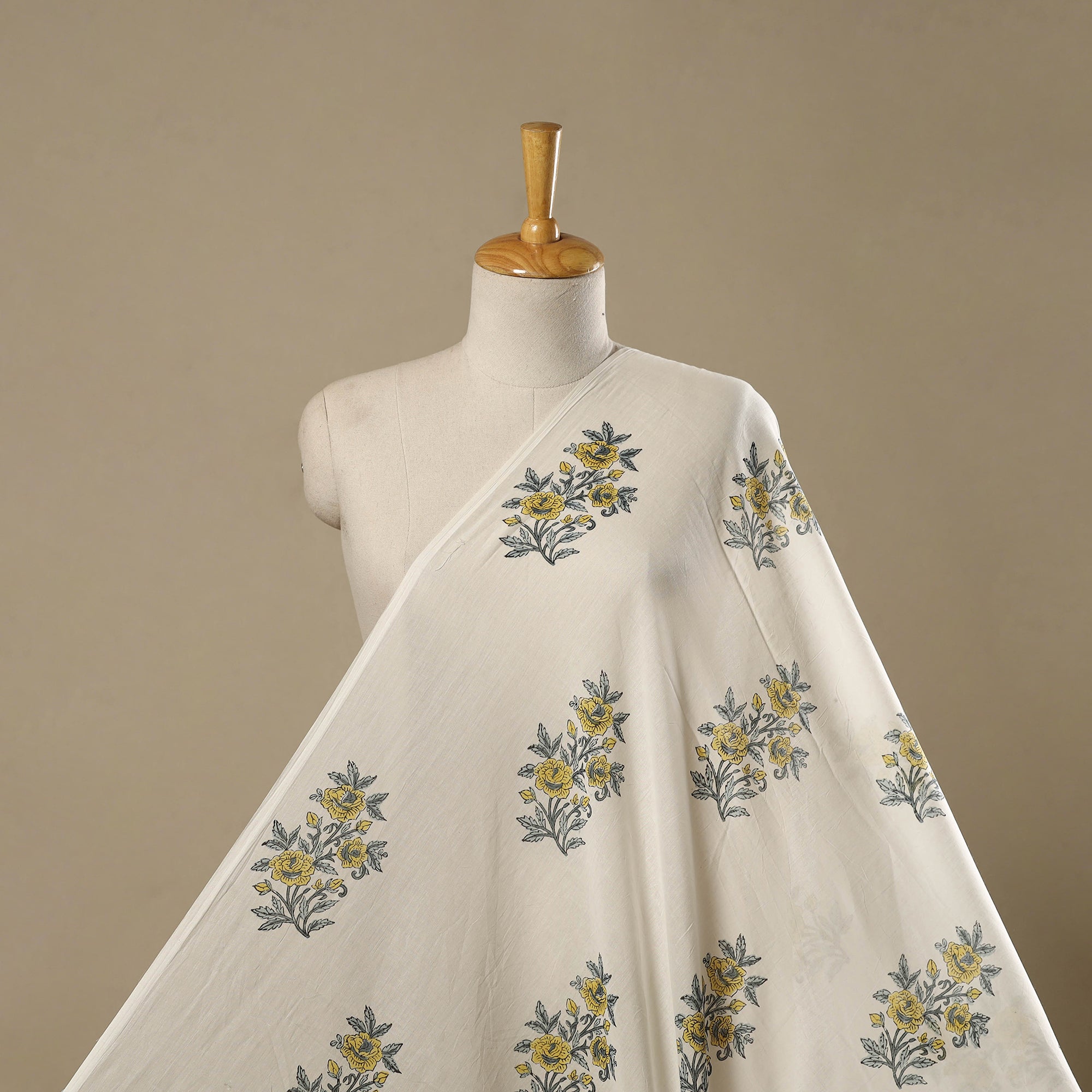 White pure mul cotton mughal butta hand block print sanganeri fabric is crafted by skilled artisans in Sanganer, Jaipur, using traditional wooden blocks. The mughal butta motifs are inspired by floral patterns popular during the Mughal era and are known for their fine detailing. This printing tradition is over 500 years old and has been passed down through generations. Made from lightweight, breathable mul cotton, the fabric is ideal for kurtas, dresses, tunics and home decor pieces such as cushion covers and curtains.
