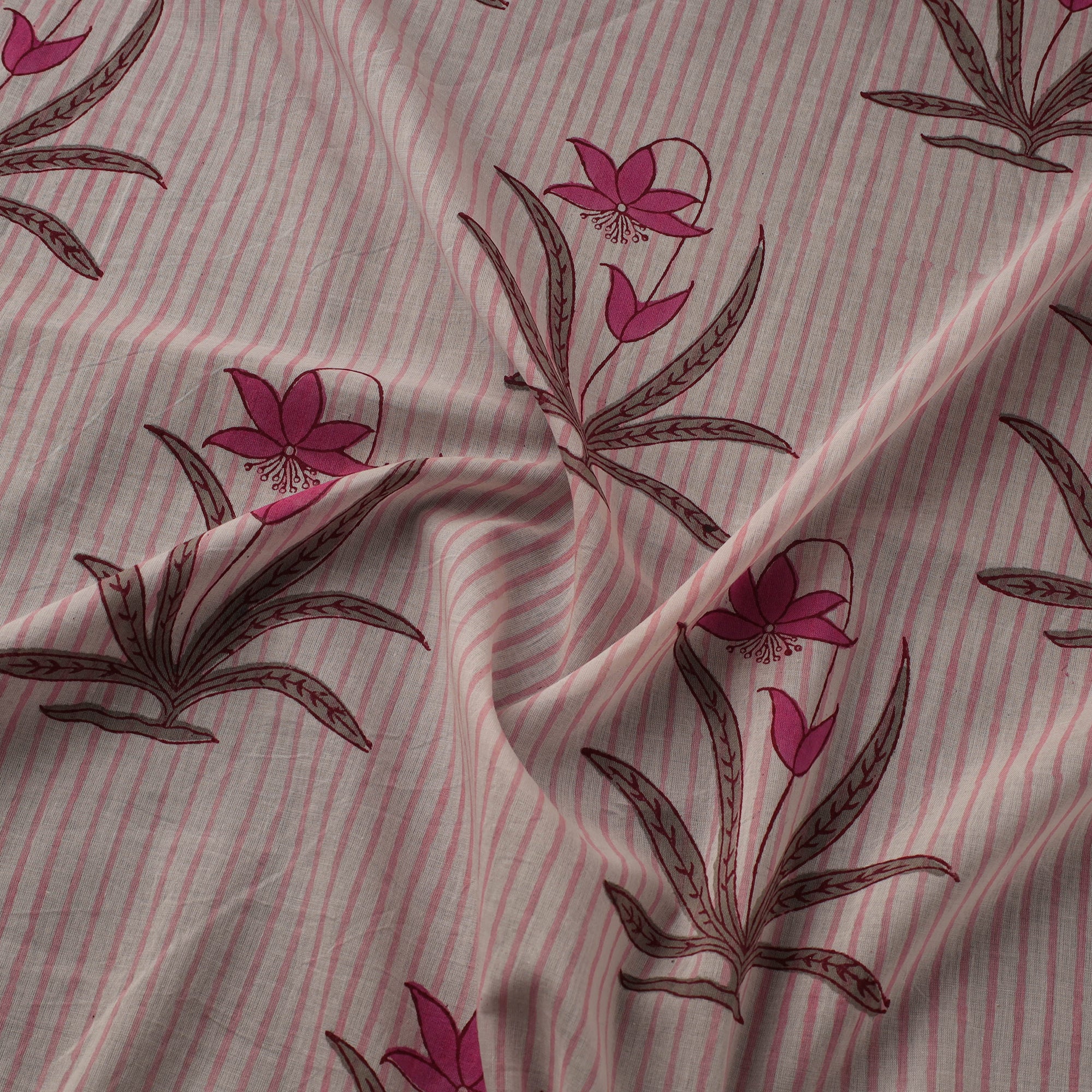Pink pure mul cotton mughal butta hand block print sanganeri fabric is crafted by skilled artisans in Sanganer, Jaipur, using traditional wooden blocks. The mughal butta motifs are inspired by floral patterns popular during the Mughal era and are known for their fine detailing. This printing tradition is over 500 years old and has been passed down through generations. Made from lightweight, breathable mul cotton, the fabric is ideal for kurtas, dresses, tunics and home decor pieces such as cushion covers and curtains.