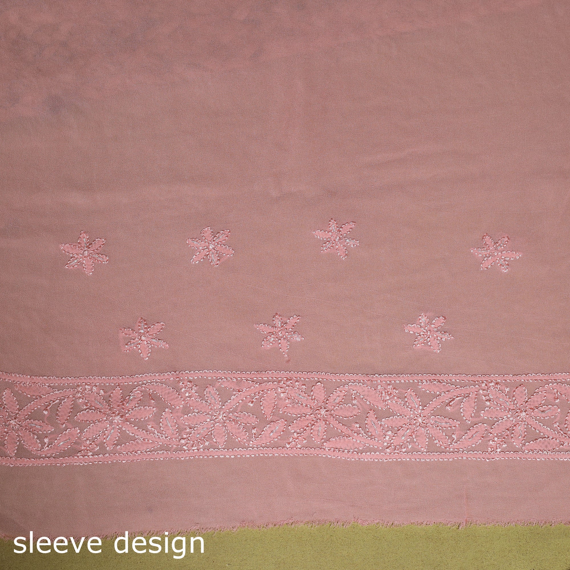 Intricately and artfully crafted, this pink heavy beadwork mukaish chikankari georgette viscose blend saree celebrates the heritage handwork of Lucknow, Uttar Pradesh. Known for its delicate thread motifs and subtle elegance, Chikankari features meticulously hand-embroidered designs made with soft pastel threads that form graceful floral and paisley patterns. The saree beautifully blends tradition with artistry, making it perfect for weddings, festive celebrations, cultural gatherings, and elegant evening occasions.
