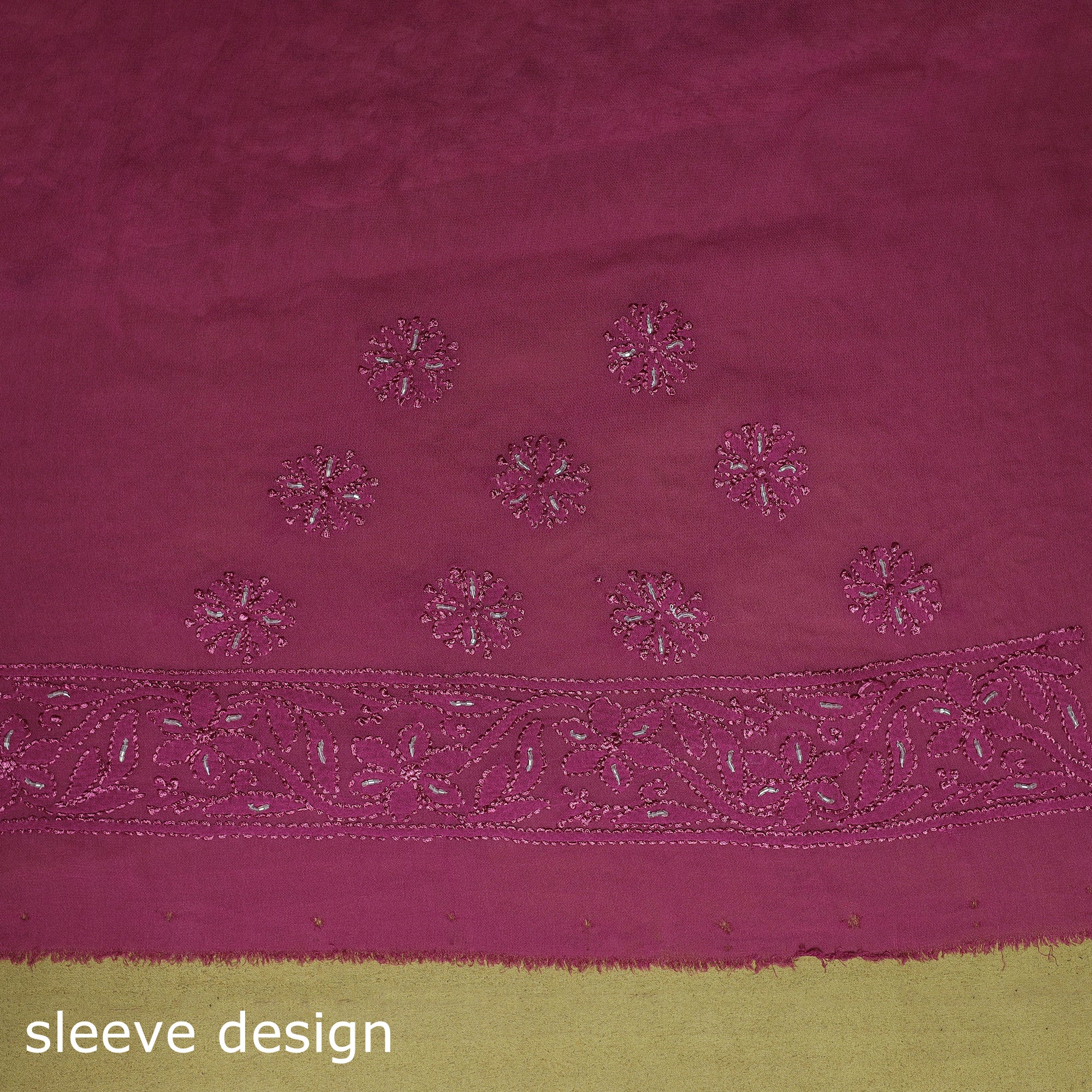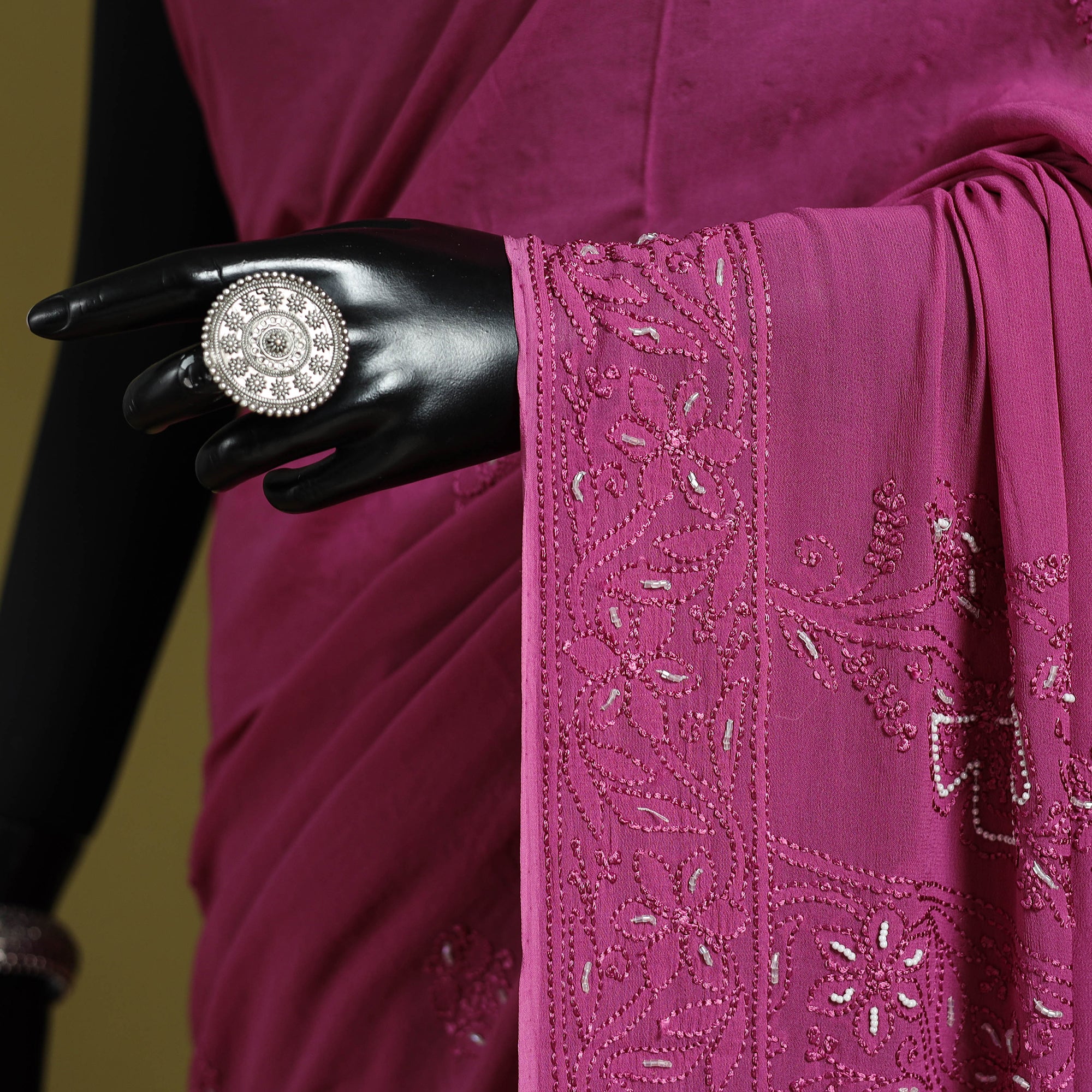 Intricately and artfully crafted, this pink heavy beadwork mukaish chikankari georgette viscose blend saree celebrates the heritage handwork of Lucknow, Uttar Pradesh. Known for its delicate thread motifs and subtle elegance, Chikankari features meticulously hand-embroidered designs made with soft pastel threads that form graceful floral and paisley patterns. The saree beautifully blends tradition with artistry, making it perfect for weddings, festive celebrations, cultural gatherings, and elegant evening occasions.