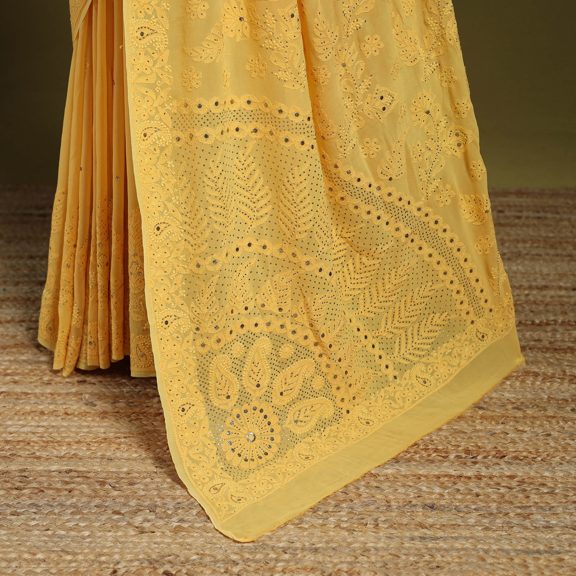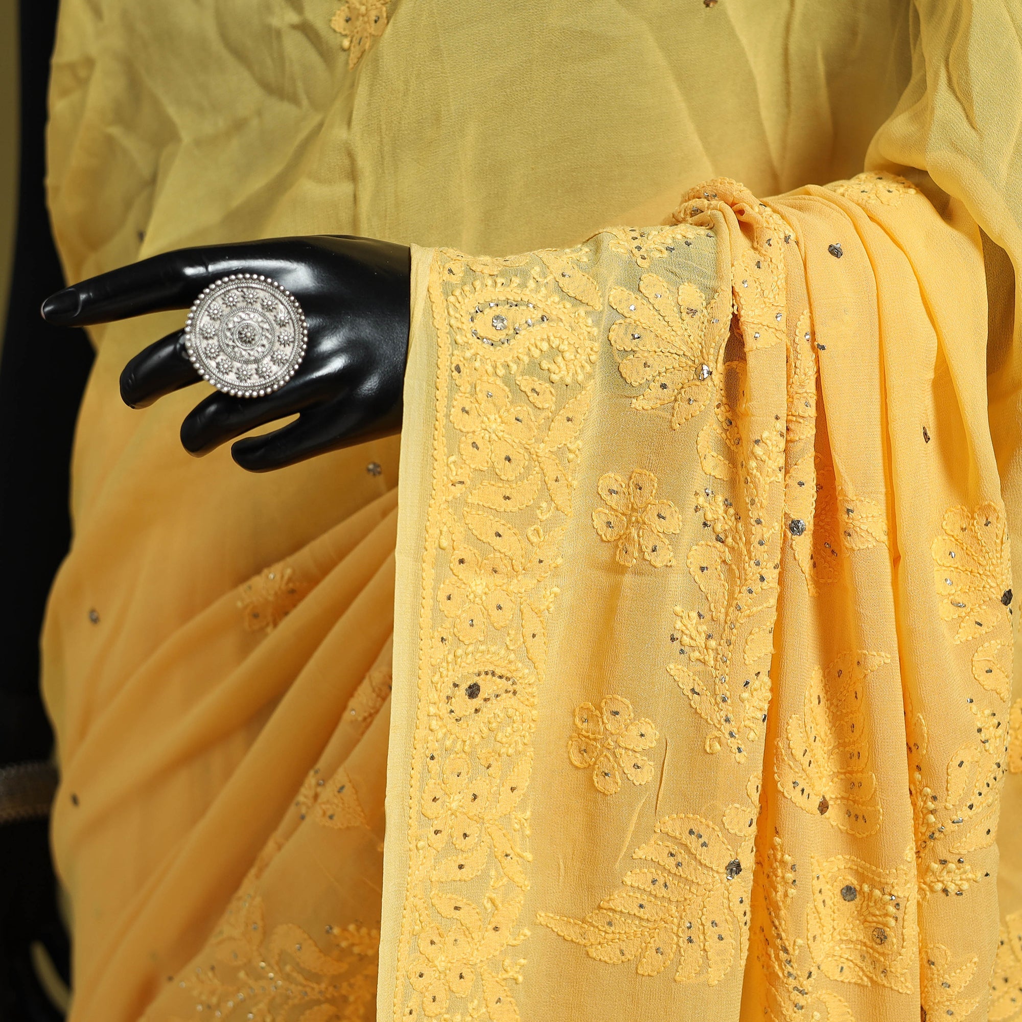 Intricately and artfully crafted, this yellow heavy mukaish chikankari georgette viscose blend saree celebrates the heritage handwork of Lucknow, Uttar Pradesh. Known for its delicate thread motifs and subtle elegance, Chikankari features meticulously hand-embroidered designs made with soft pastel threads that form graceful floral and paisley patterns. The saree beautifully blends tradition with artistry, making it perfect for weddings, festive celebrations, cultural gatherings, and elegant evening occasions.