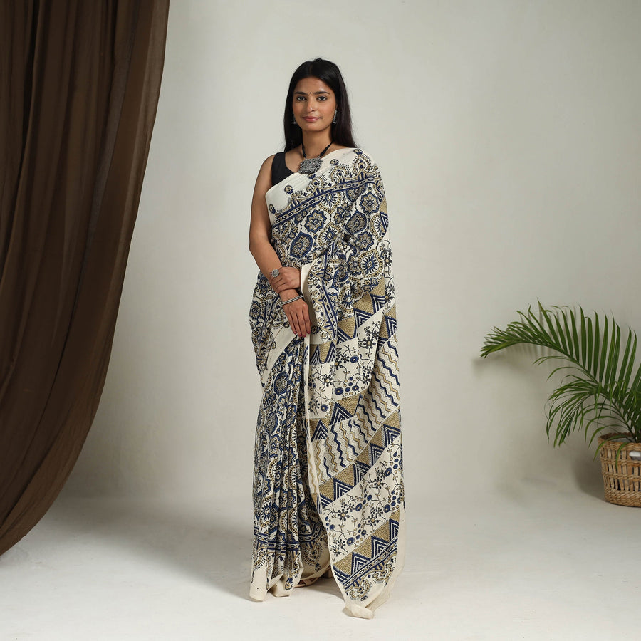This beige mul cotton ajrakh saree embodies the rich artistic heritage of Kutch, Gujarat. Skilled artisans meticulously hand-carve intricate patterns with wooden blocks, which are then dipped in natural dyes and carefully stamped in the fabric. The lightweight and breathable mul cotton enhances comfort, making it a perfect choice for both festive occasions and everyday grace.