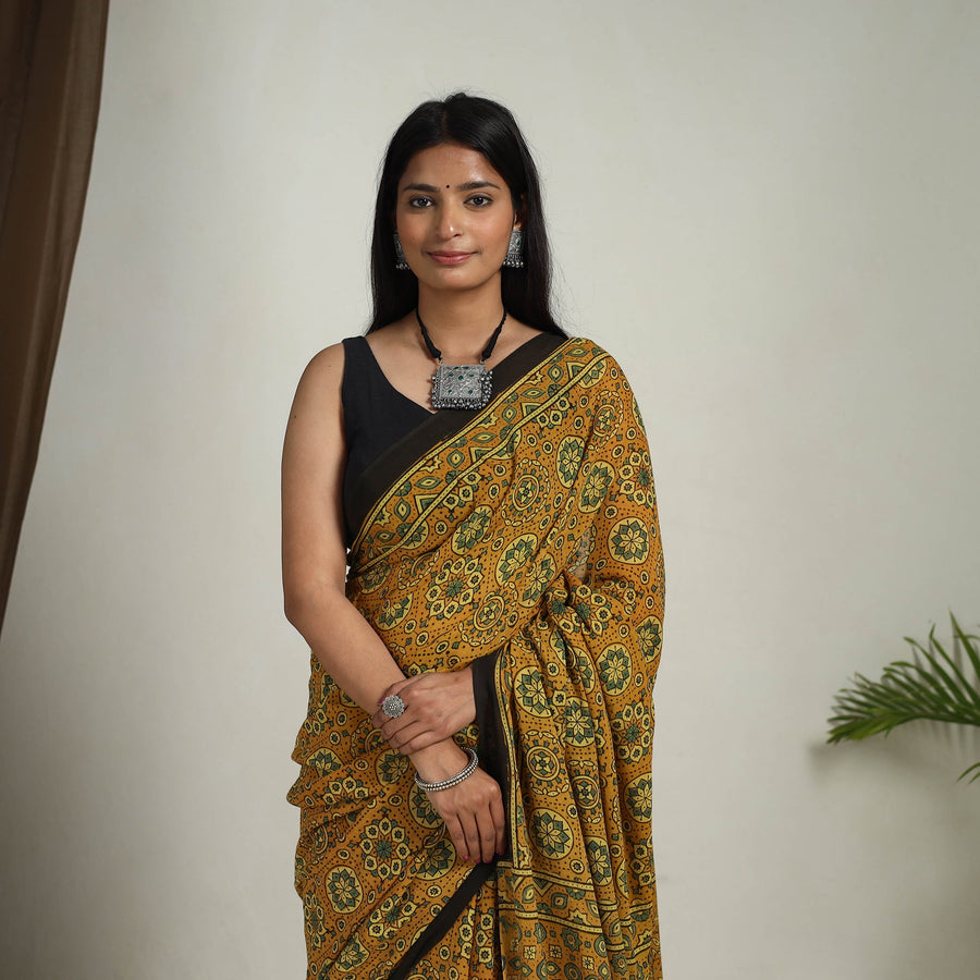 This yellow Mul Cotton Ajrakh saree embodies the rich artistic heritage of Kutch, Gujarat. Skilled artisans meticulously hand-carve intricate patterns with wooden blocks, which are then dipped in natural dyes and carefully stamped in the fabric. The lightweight and breathable mul cotton enhances comfort, making it a perfect choice for both festive occasions and everyday grace.