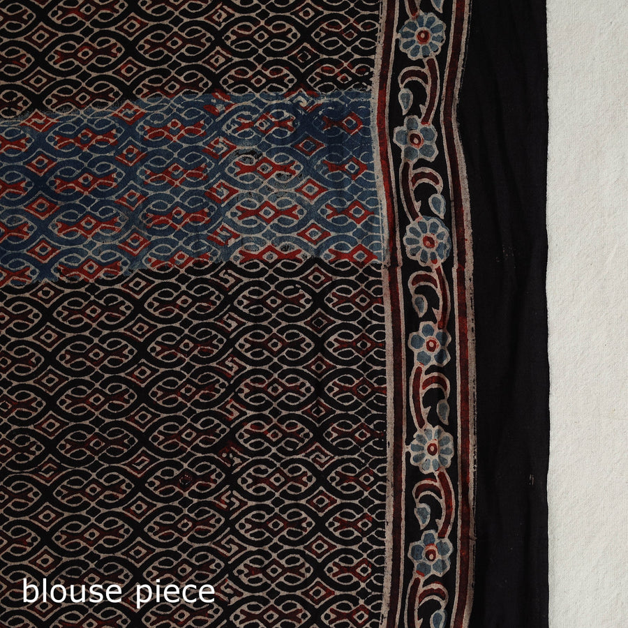 This black mul cotton ajrakh saree embodies the rich artistic heritage of Kutch, Gujarat. Skilled artisans meticulously hand-carve intricate patterns with wooden blocks, which are then dipped in natural dyes and carefully stamped in the fabric. The lightweight and breathable mul cotton enhances comfort, making it a perfect choice for both festive occasions and everyday grace.