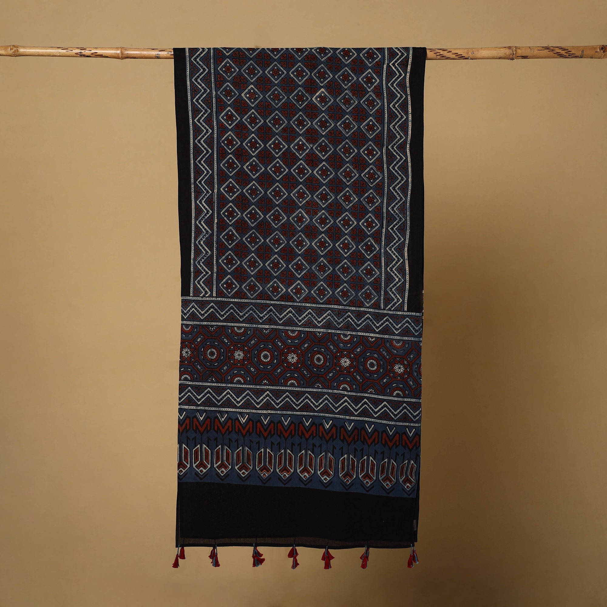 •  Blue Mul Cotton Block Print Ajrakh Stole with Tassels