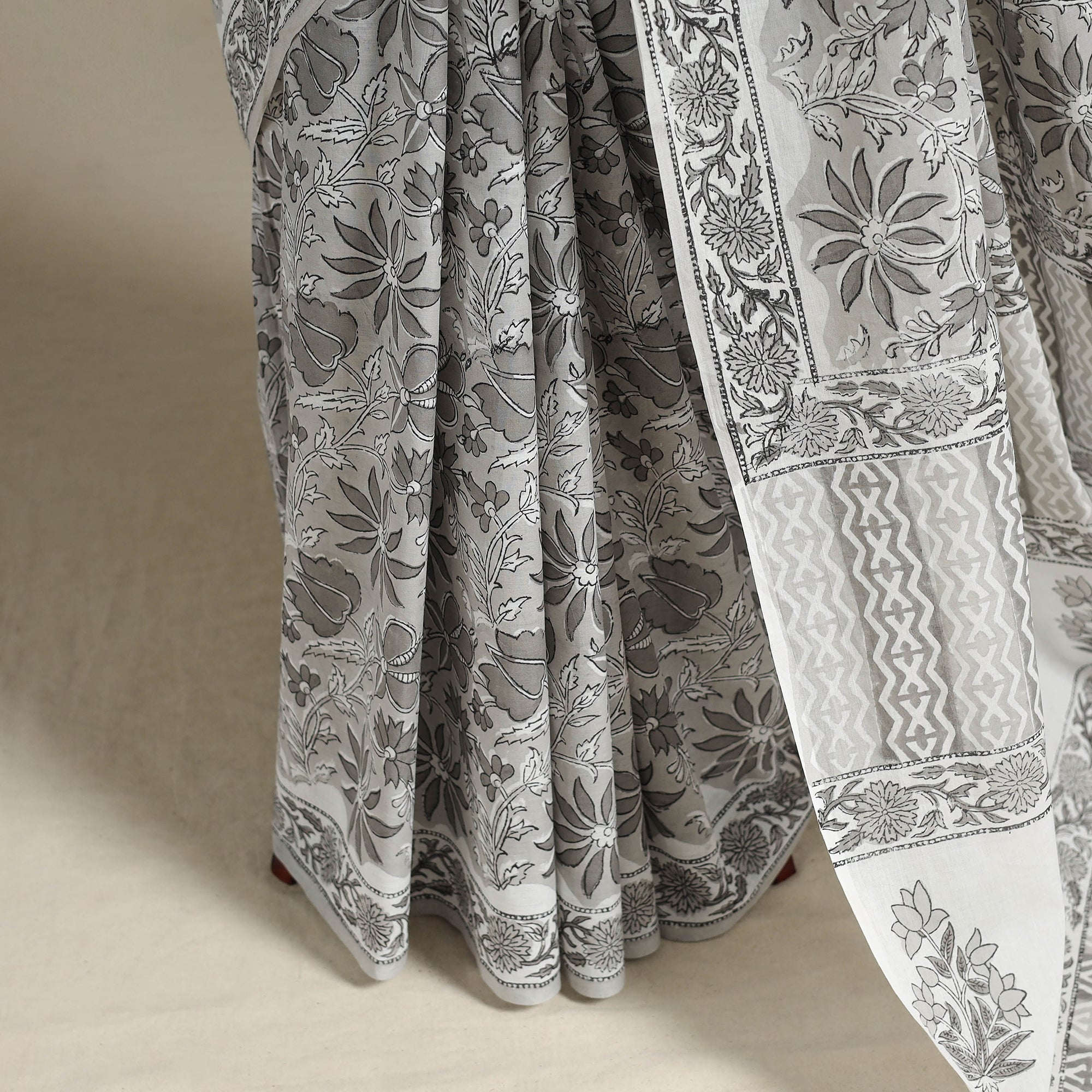Grey - Mul Cotton Block Print Sanganeri Saree 19