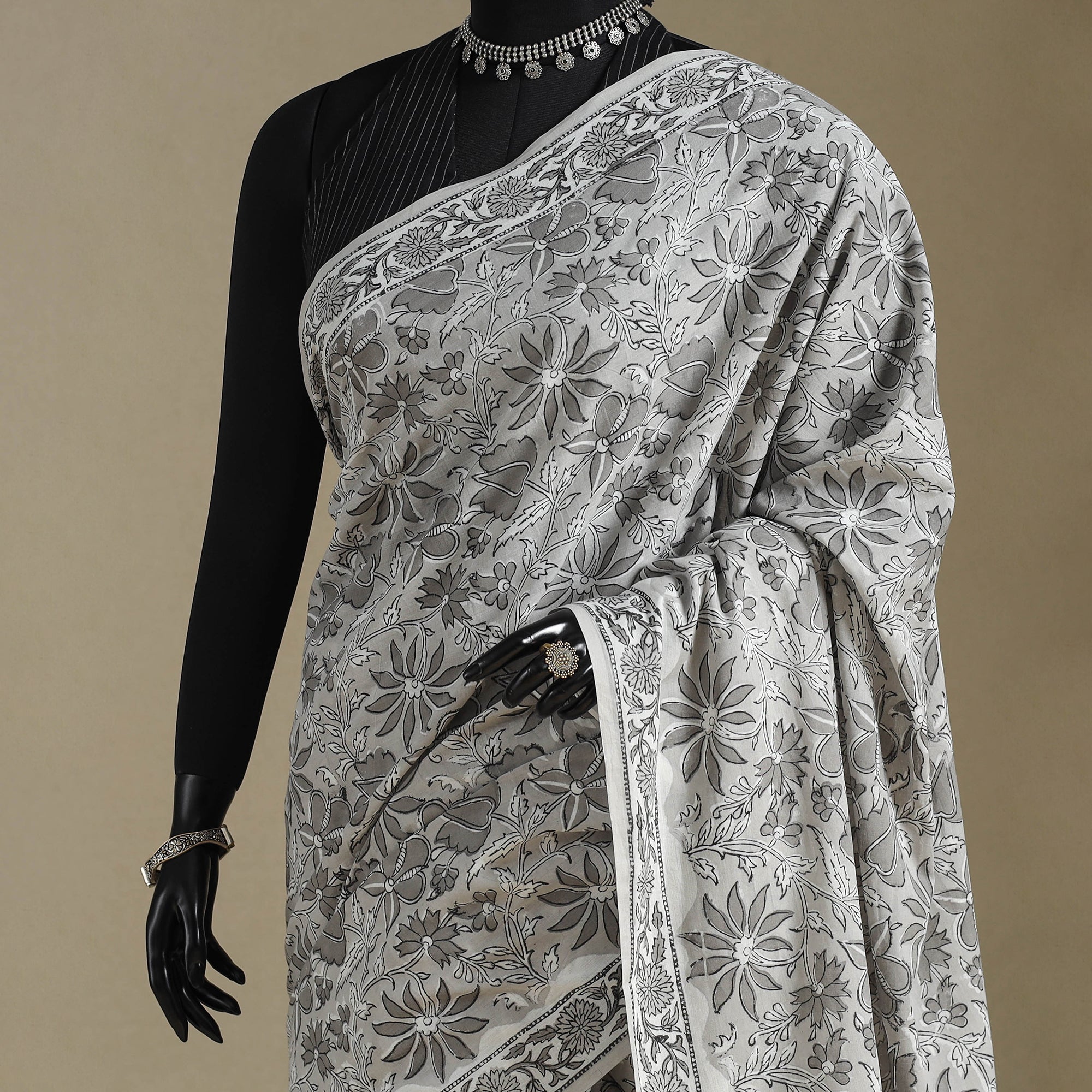 • Grey - mul cotton sanganeri saree 19 - handcrafted