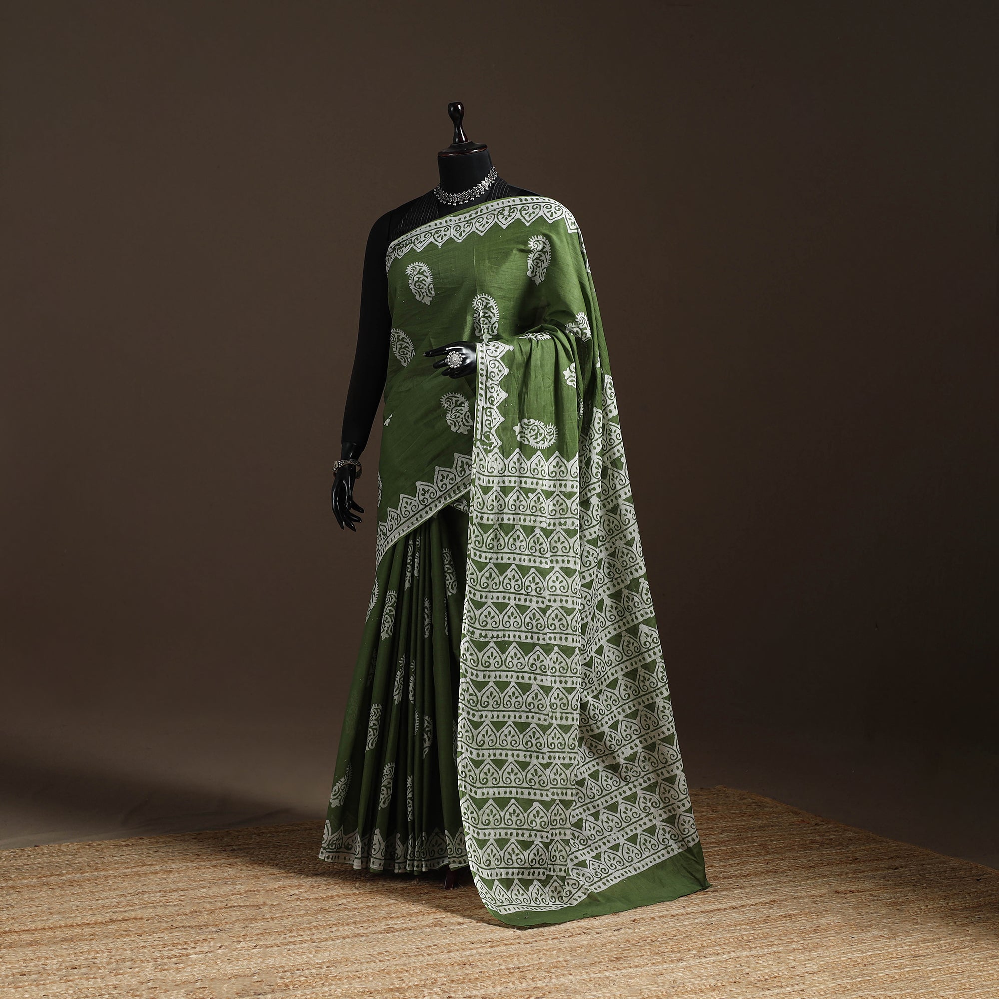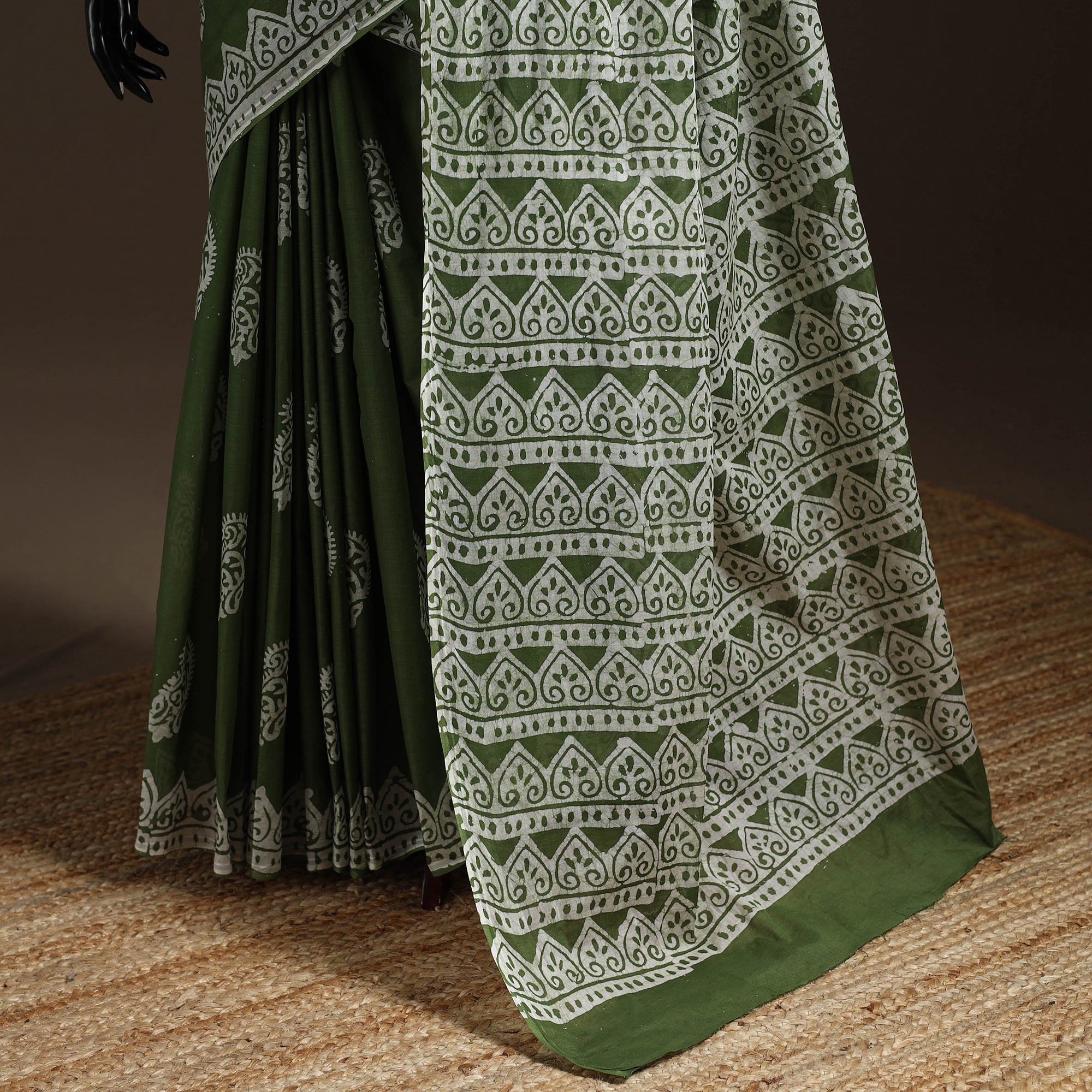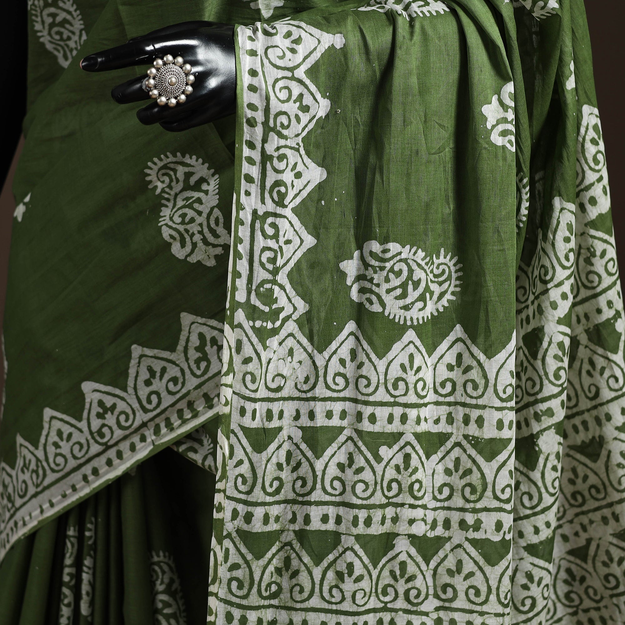 Green hand block batik print saree is crafted using the traditional wax-resist dyeing technique. In Batik, wax is applied to form patterns and the dyeing process creates a crackle effect that makes every piece unique. Made from pure mul cotton, it is lightweight and breathable, ensuring comfort throughout the day. It is suitable for festive occasions, cultural gatherings or for adding a traditional touch to everyday wear.
