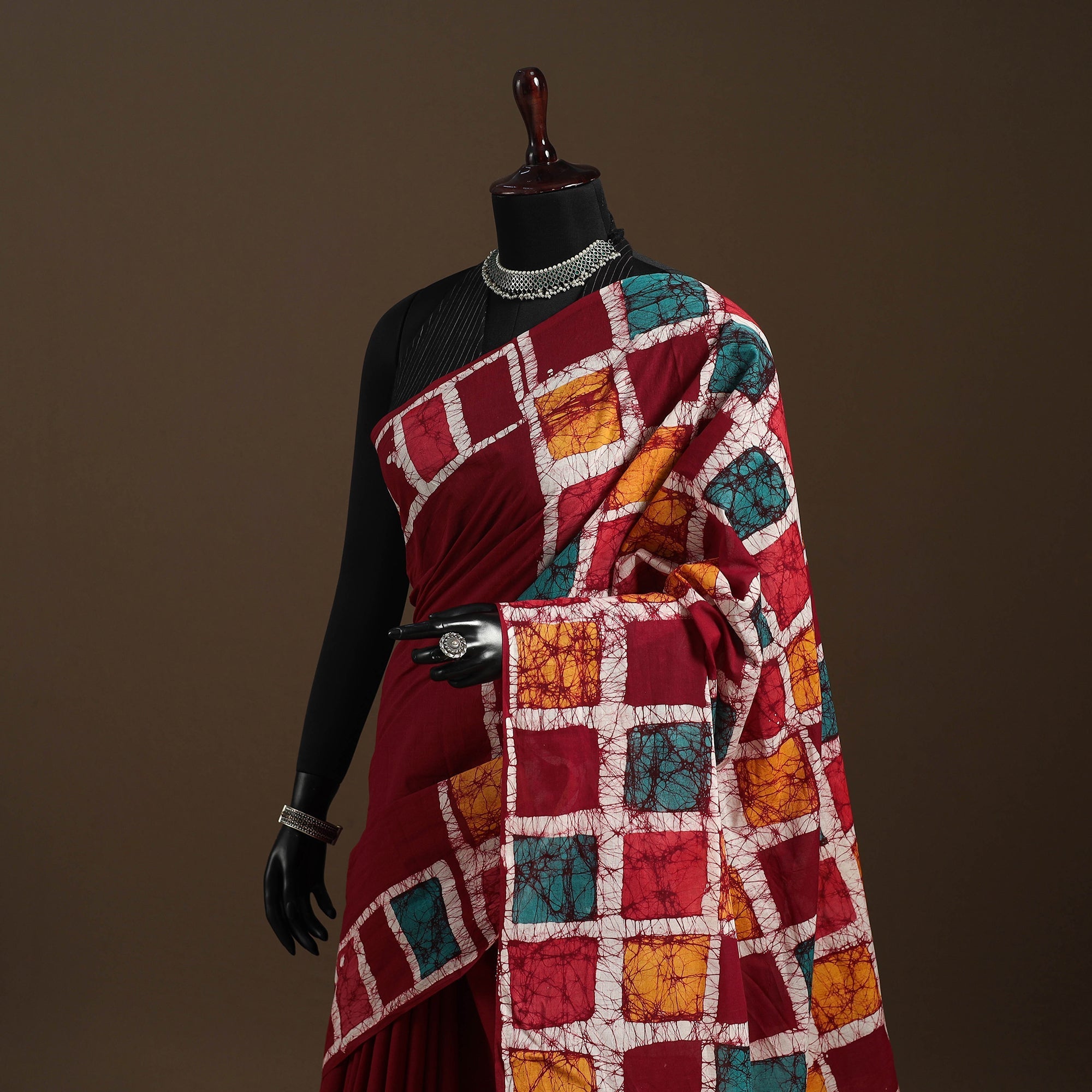 Batik is a very famous technique of wax-resist dyeing applied to whole cloth. The traditional designs and motifs in Indian batik are exceptional. It is a type of resist printing process wherein wax is applied to the fabric in specific areas.
