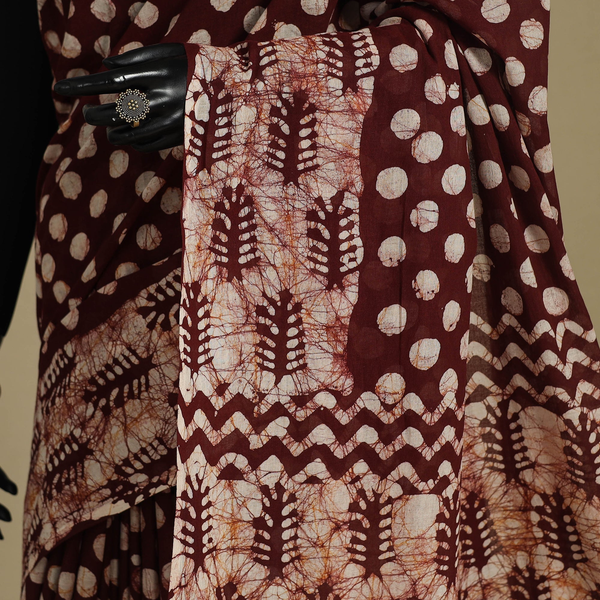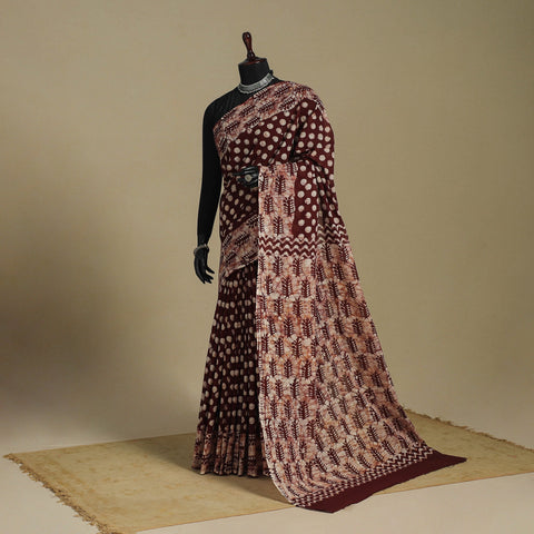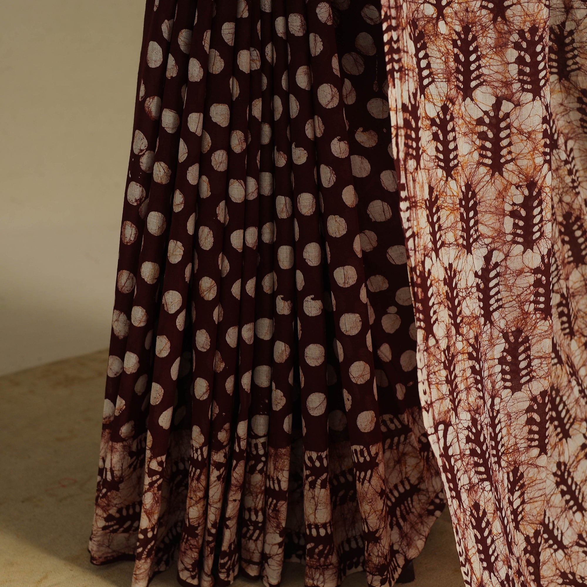 This brown mul cotton batik print saree is crafted using the traditional wax-resist batik technique, giving it a distinctive appeal. Lightweight and breathable, it ensures ease and comfort all day long, making it ideal for festive occasions, cultural gatherings, or adding a touch of traditional elegance to everyday wear.