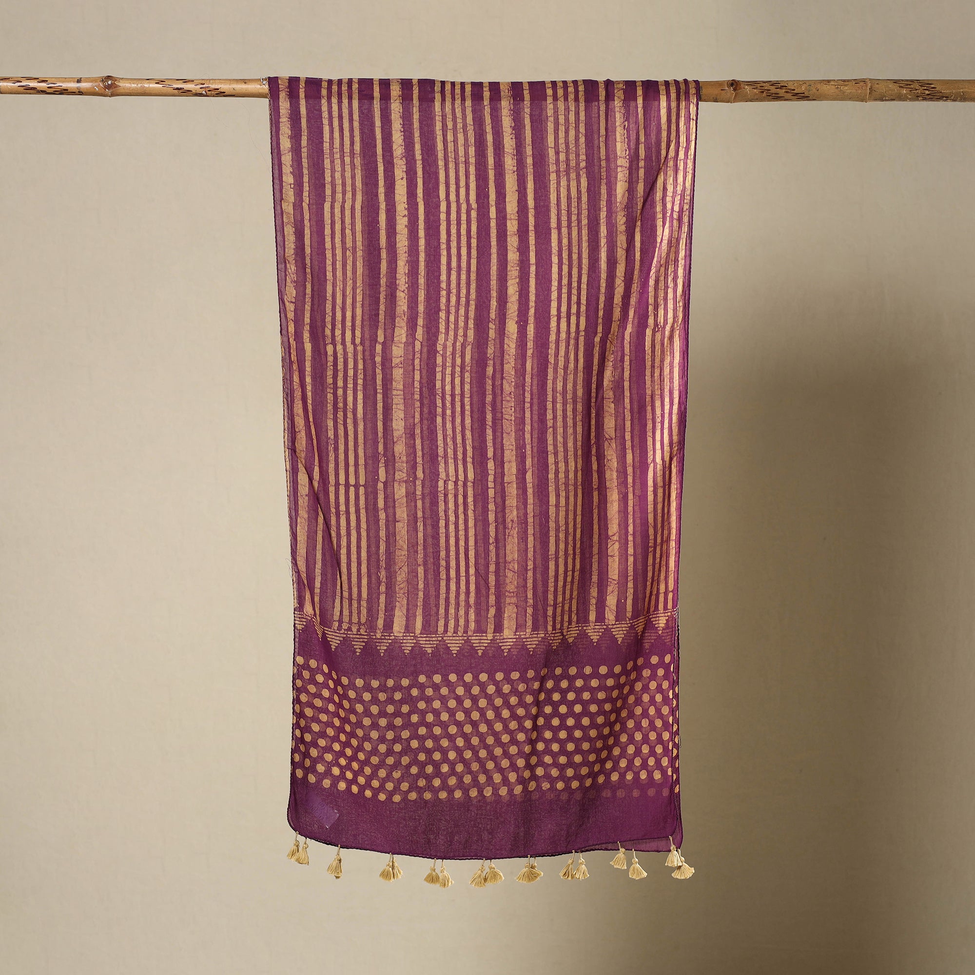 This elegant purple stole, featuring traditional batik prints, is made with soft mul cotton by Shakil Ahmed Khatri of Kutch. Created through wax-resist dyeing, it offers a gentle touch, airy feel, and tassel detailing, making it suitable for every season's wear.