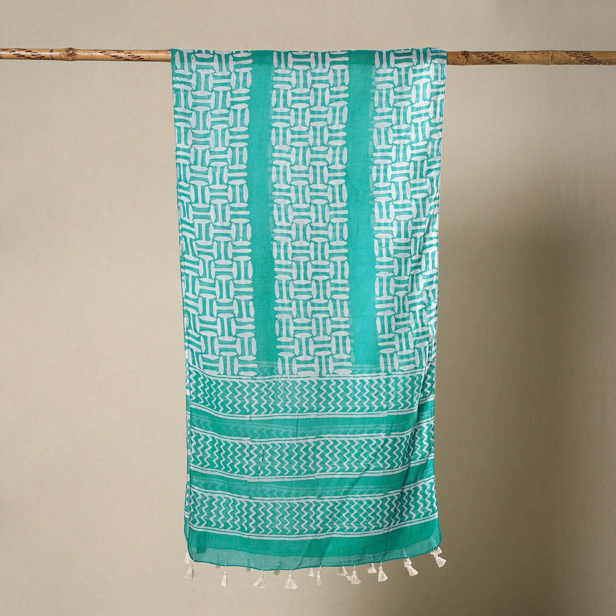 This elegant green stole, featuring traditional batik prints, is made with soft mul cotton by Shakil Ahmed Khatri of Kutch. Created through wax-resist dyeing, it offers a gentle touch, airy feel, and tassel detailing, making it suitable for every season's wear.