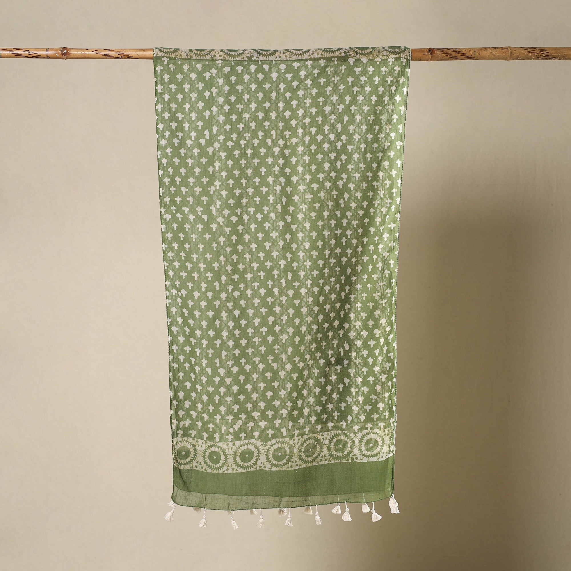 This elegant green stole, featuring traditional batik prints, is made with soft mul cotton by Shakil Ahmed Khatri of Kutch. Created through wax-resist dyeing, it offers a gentle touch, airy feel, and tassel detailing, making it suitable for every season's wear.