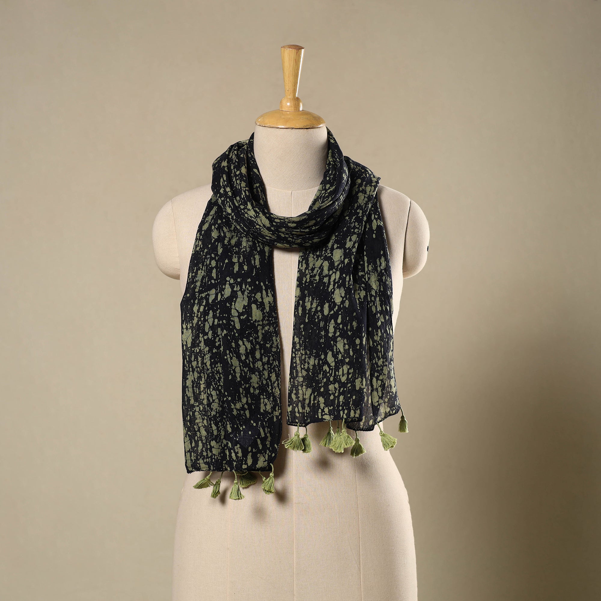 This elegant green stole, featuring traditional batik prints, is made with soft mul cotton by Shakil Ahmed Khatri of Kutch. Created through wax-resist dyeing, it offers a gentle touch, airy feel, and tassel detailing, making it suitable for every season's wear.