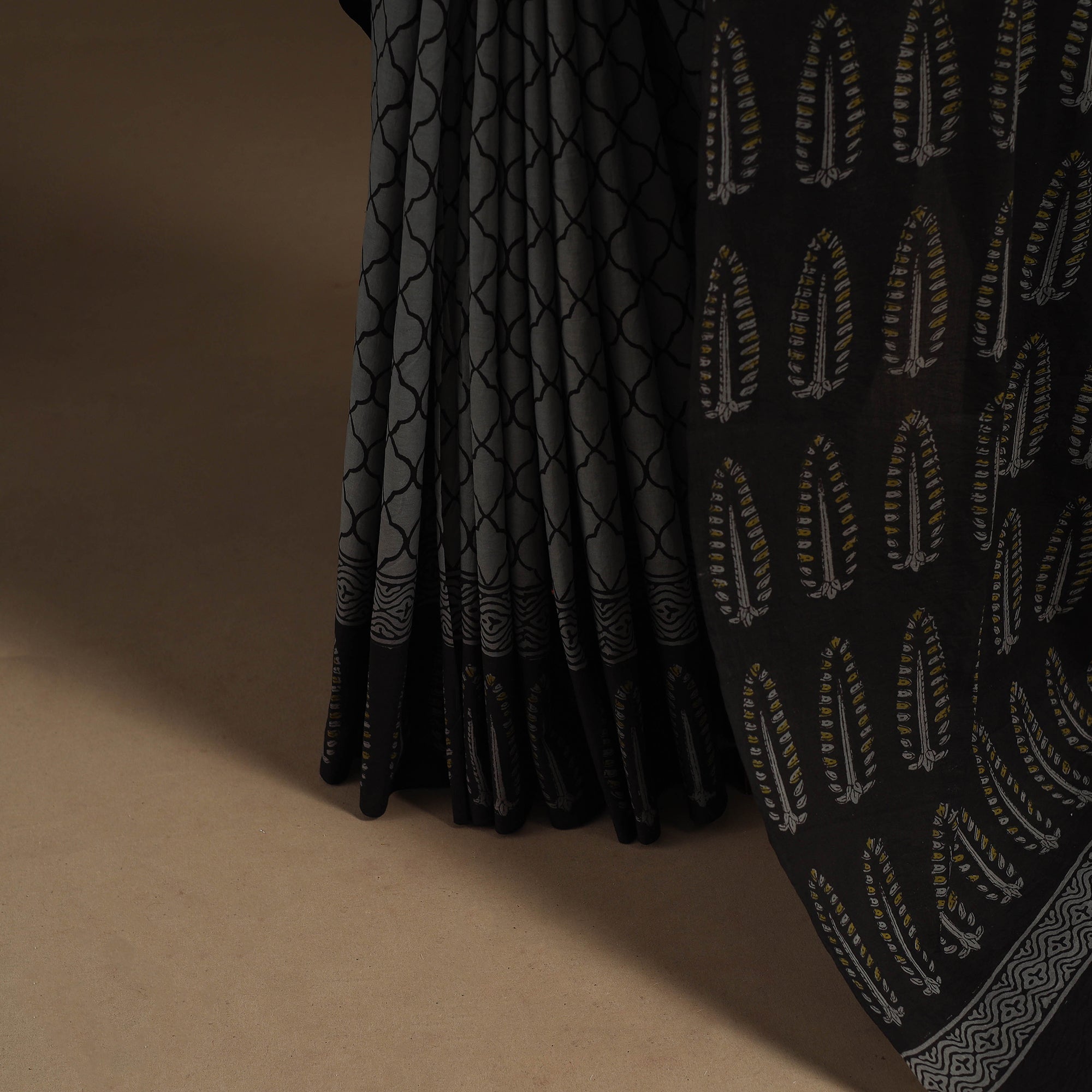 This grey mulmul cotton saree features traditional bagru block printing, known for its bold and intricate patterns. Crafted with hand-carved wooden blocks and dyed using natural colours, the saree is soft, breathable, and perfect for all-day wear. Whether for everyday elegance or a special occasion, it offers a perfect blend of comfort and timeless style.