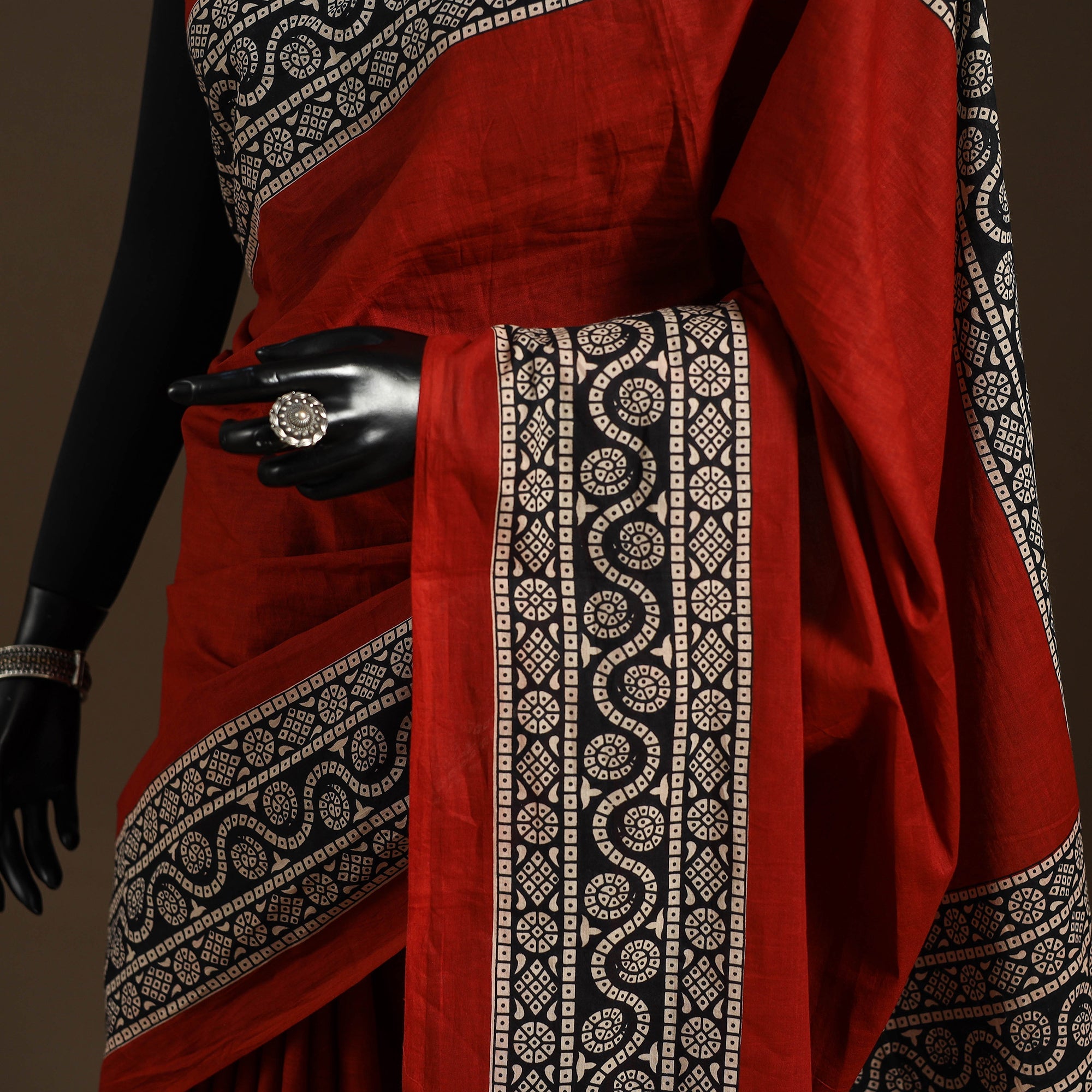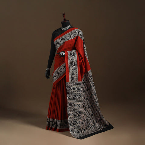 This red mulmul cotton saree features traditional bagru block printing, known for its bold and intricate patterns. Crafted with hand-carved wooden blocks and dyed using natural colours, the saree is soft, breathable, and perfect for all-day wear. Whether for everyday elegance or a special occasion, it offers a perfect blend of comfort and timeless style.