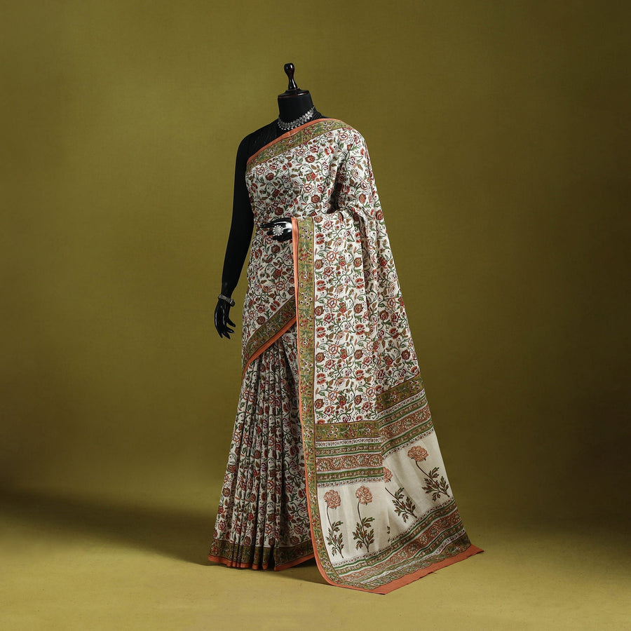 White hand block printed sanganeri mul cotton saree, featuring intricate patterns and rich vat-dyed colours. Blending elegance with cultural heritage, it is suitable for festive occasions, everyday wear or gifting. This saree brings a graceful and artisanal touch to any wardrobe.