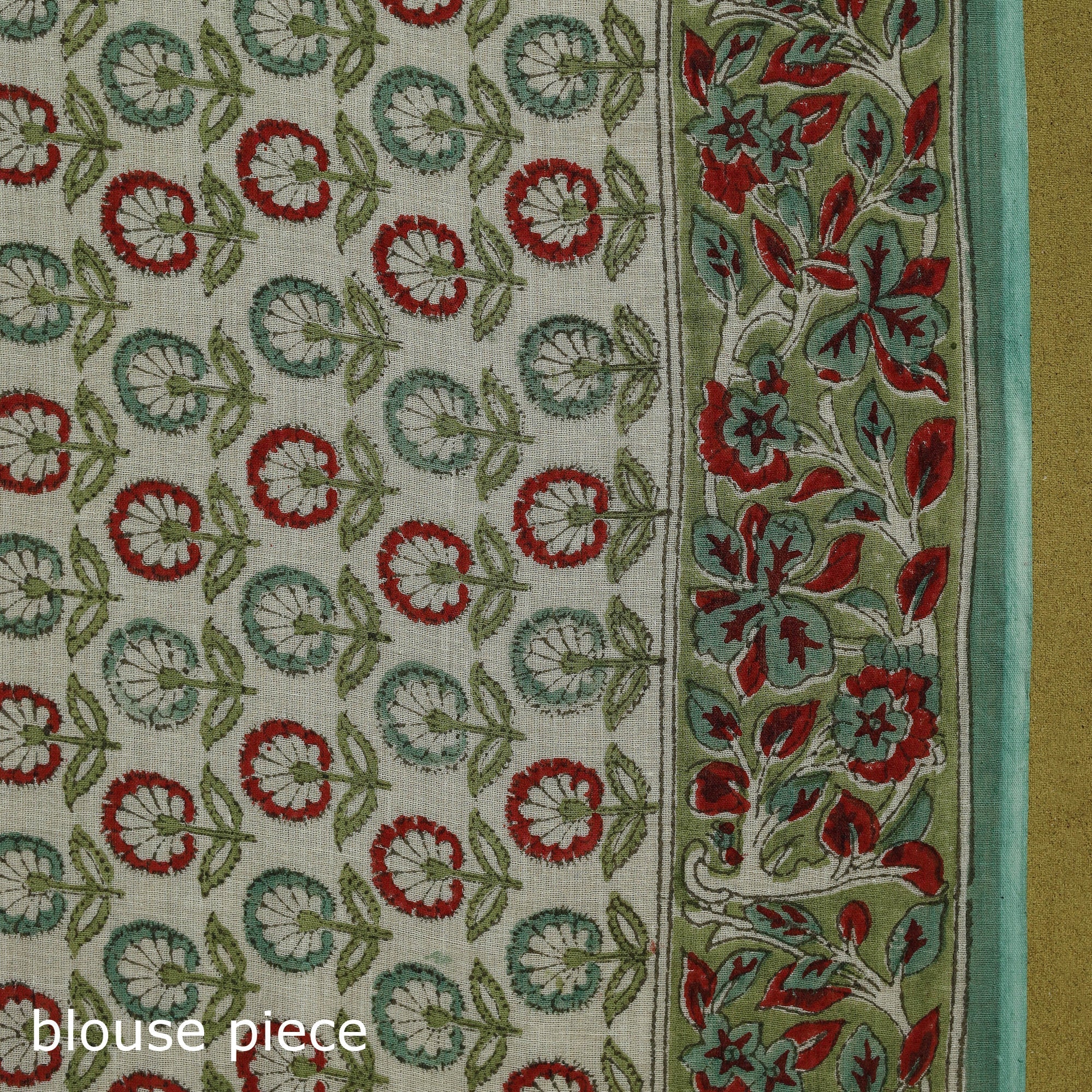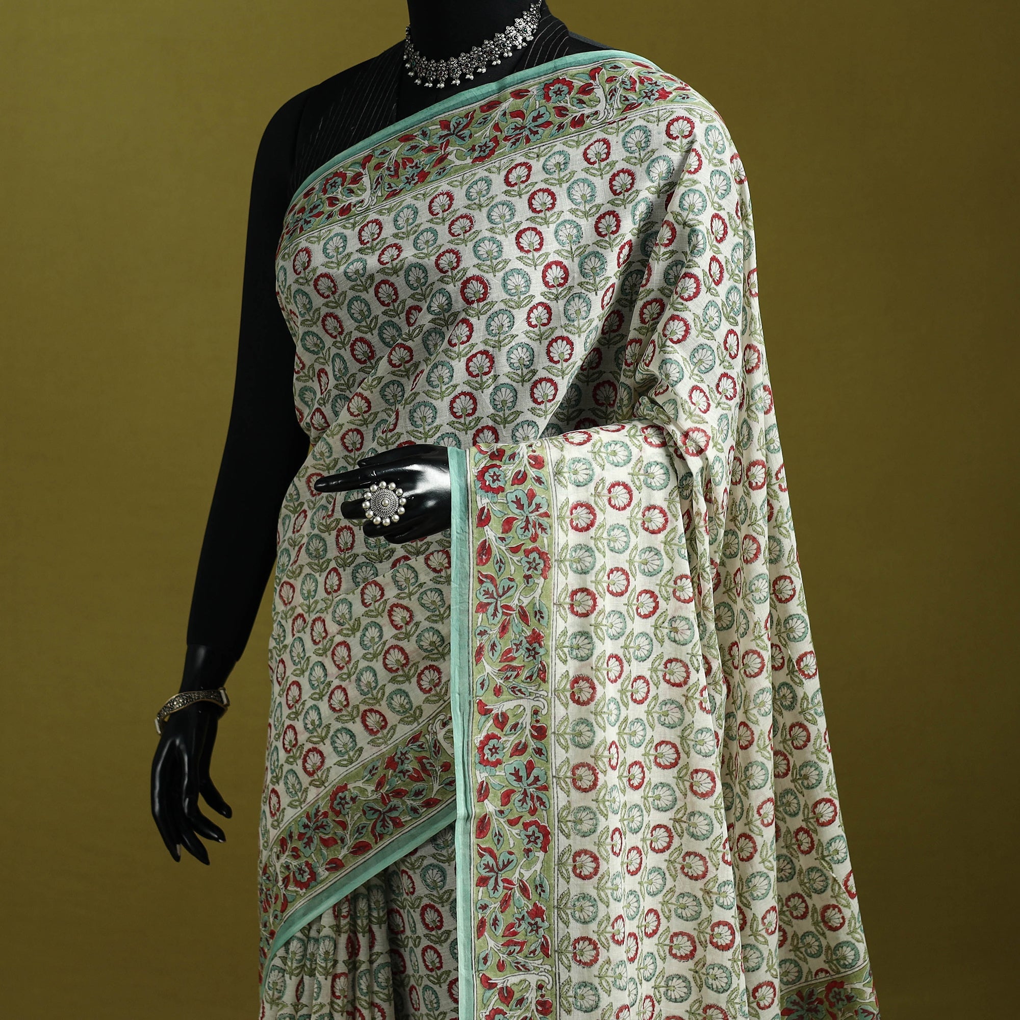 Green hand block printed sanganeri mul cotton saree, featuring intricate patterns and rich vat-dyed colours. Blending elegance with cultural heritage, it is suitable for festive occasions, everyday wear or gifting. This saree brings a graceful and artisanal touch to any wardrobe.