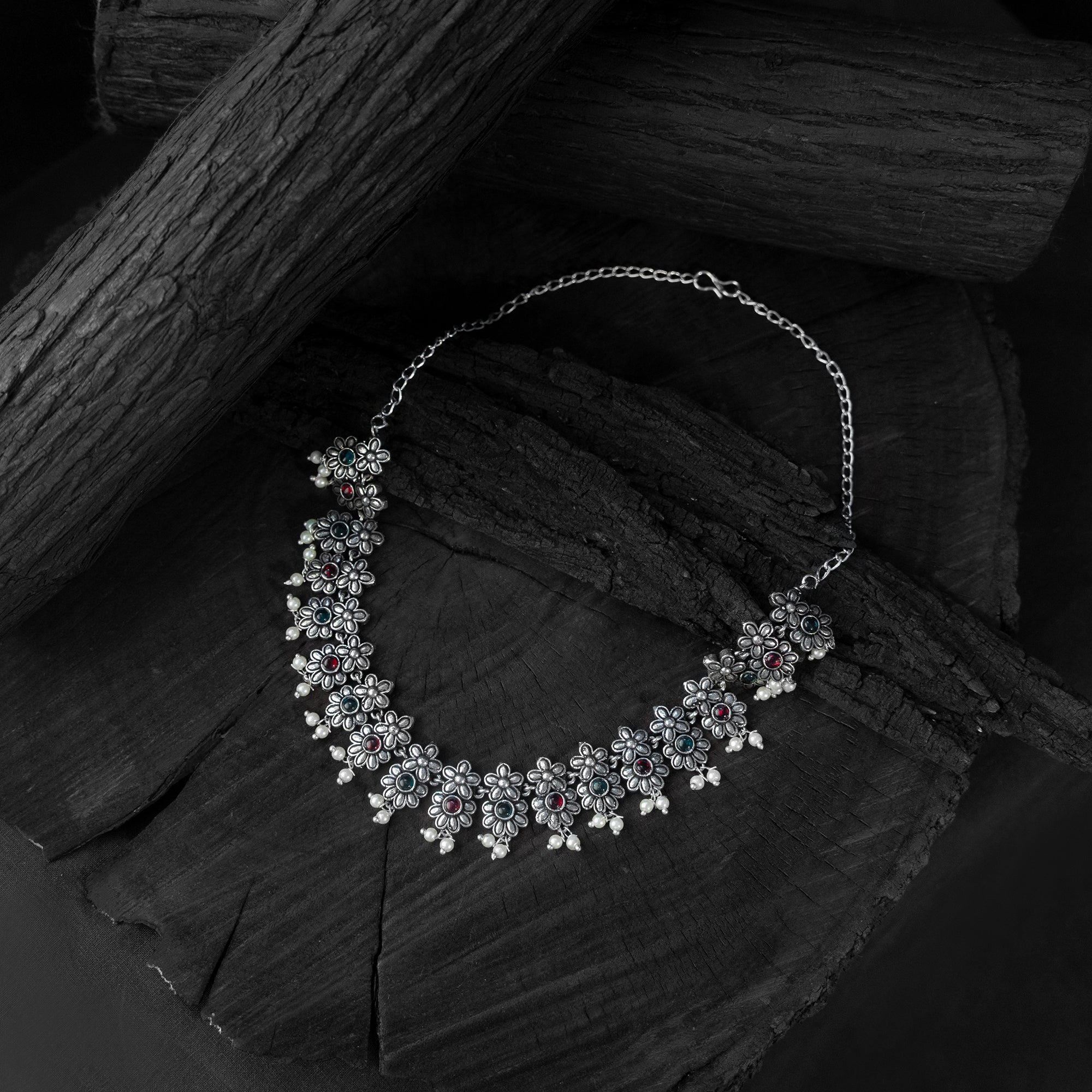 Oxidised handcrafted multicolor necklace set features intricate detailing using varied materials like metal, stones pearls, and artistic motifs. Perfect for festive occasions, weddings, office wear or casual styling it pairs beautifully with sarees, kurtas, or contemporary outfits. Complete with matching earrings, this set makes for a thoughtful gift for mother, sister, wife, or girlfriend adding beauty and grace to every special moment.