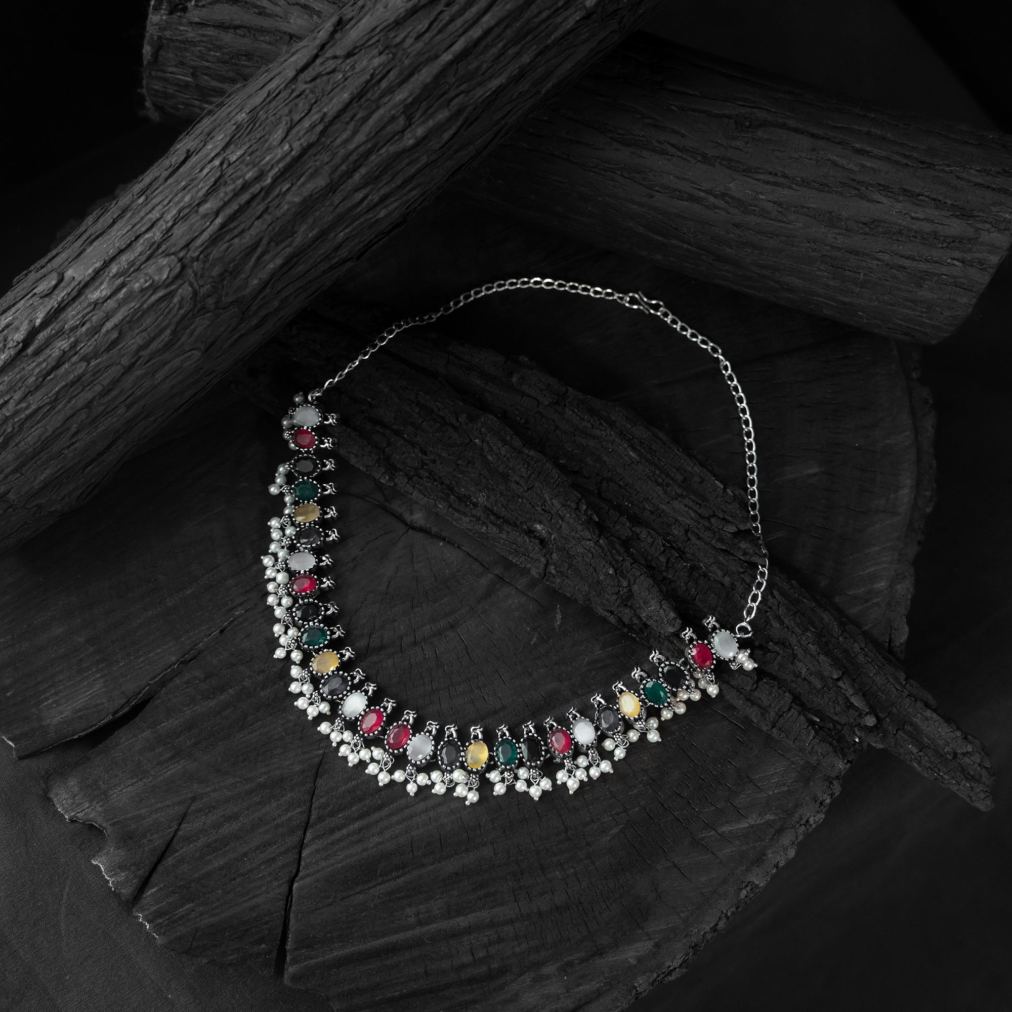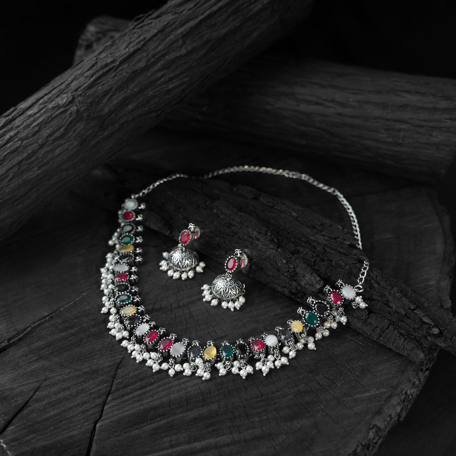 Oxidised handcrafted multicolor necklace set features intricate detailing using varied materials like metal, stones, pearls and artistic motifs. Perfect for festive occasions, weddings, office wear or casual styling it pairs beautifully with sarees, kurtas, or contemporary outfits. Complete with matching earrings, this set makes for a thoughtful gift for mother, sister, wife, or girlfriend adding beauty and grace to every special moment.