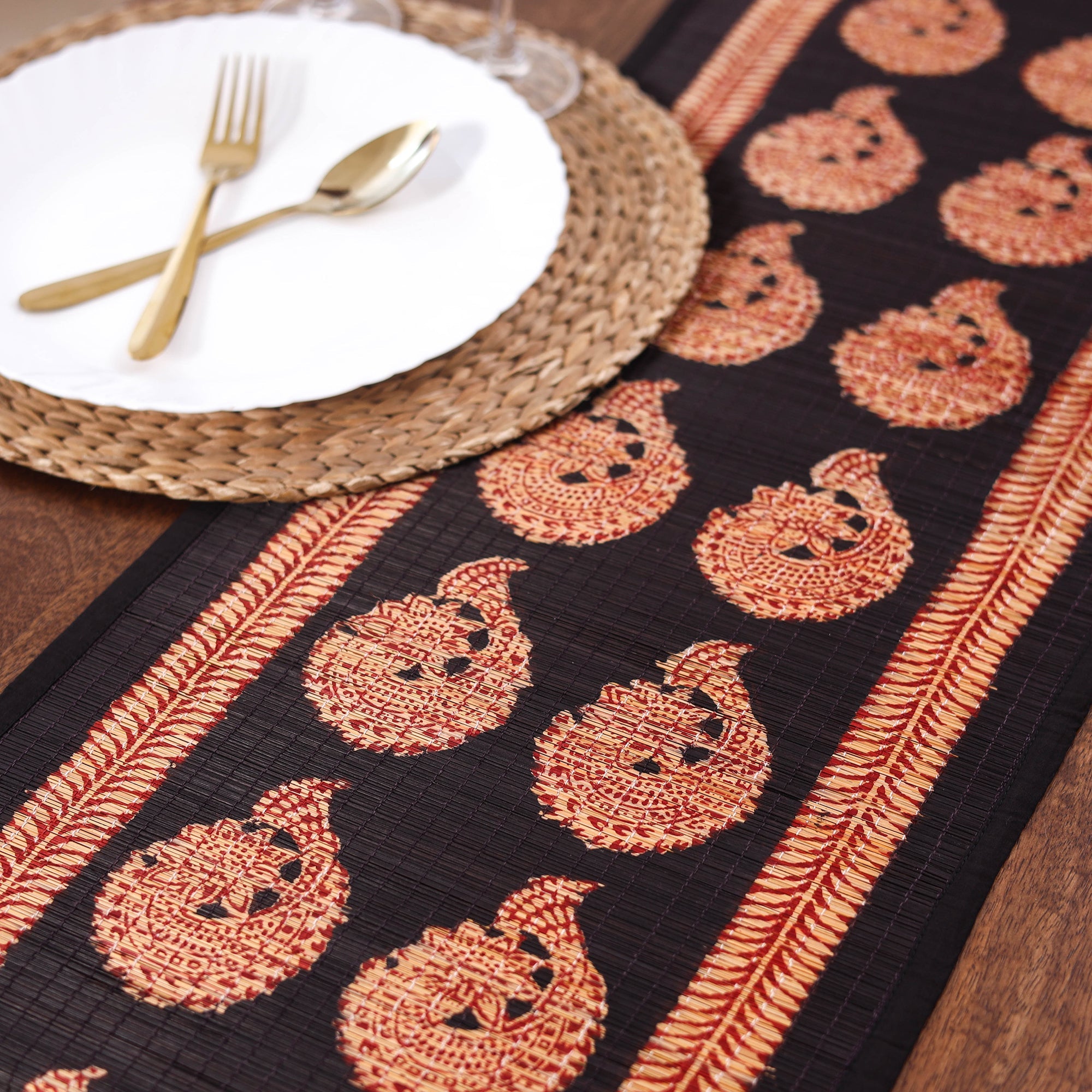 Elevate your dining space with this black natural bamboo bagh block printed dining table runner, a testament to Madhya Pradesh’s rich artistic heritage. Using natural dyes and traditional techniques, artisans led by master craftsman Bilal Khatri create intricate floral patterns that exude timeless elegance. This eco-friendly, cotton-edged piece merges sustainability with artistry. Perfect for dining or table decor, it supports fair trade and cultural preservation.