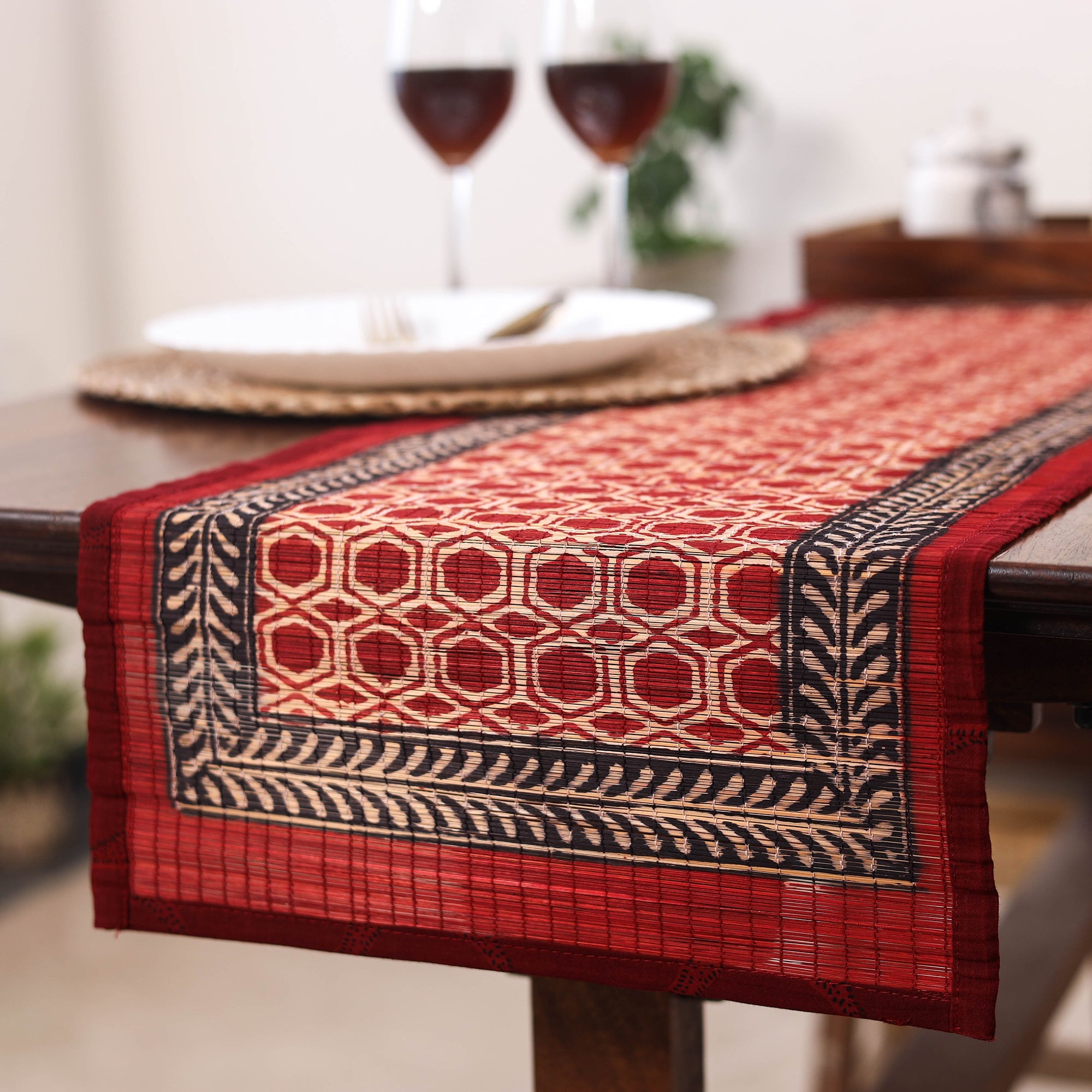 Elevate your dining space with this red natural bamboo bagh block printed dining table runner, a testament to Madhya Pradesh’s rich artistic heritage. Using natural dyes and traditional techniques, artisans led by master craftsman Bilal Khatri create intricate floral patterns that exude timeless elegance. This eco-friendly, cotton-edged piece merges sustainability with artistry. Perfect for dining or table decor, it supports fair trade and cultural preservation.