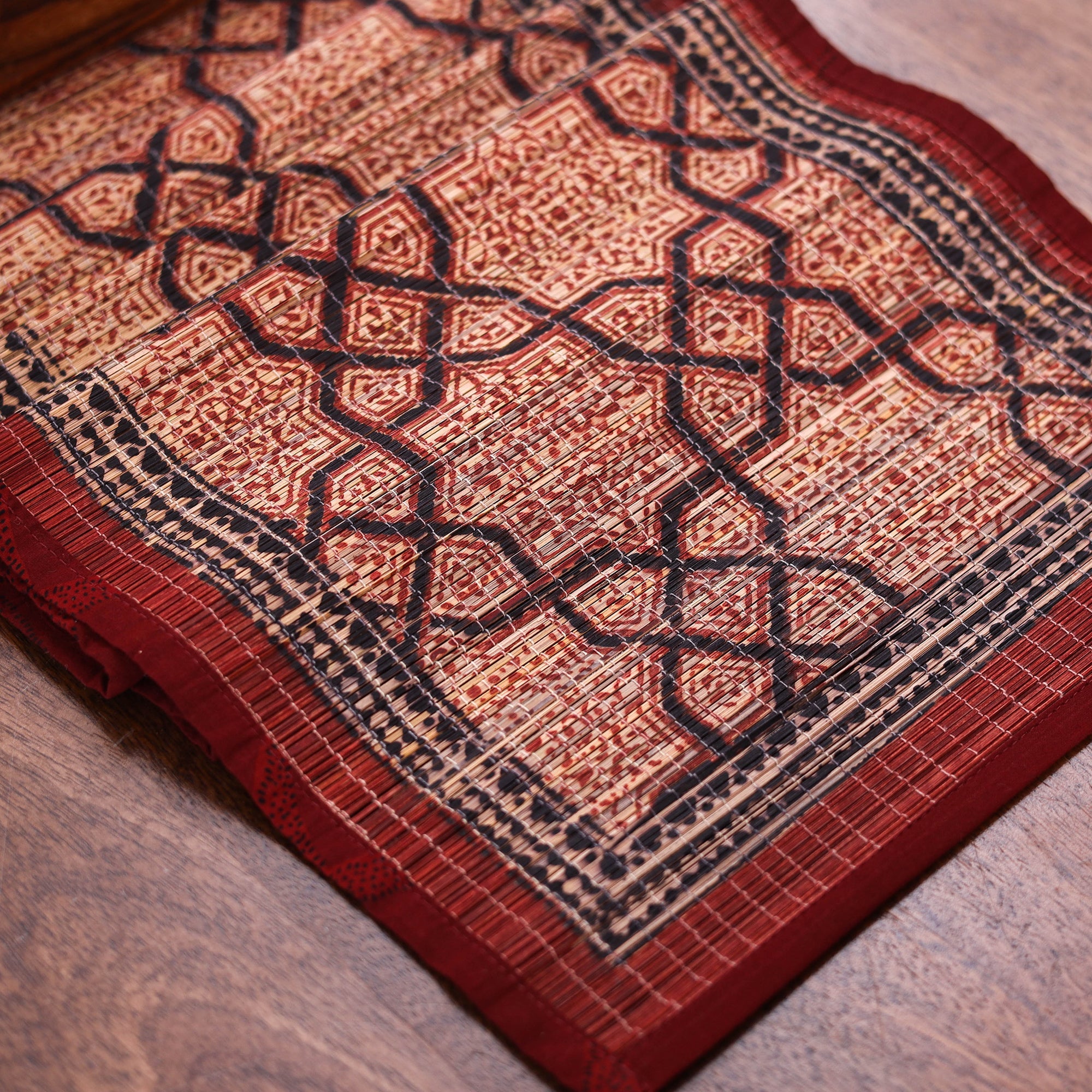 Elevate your dining space with this red natural bamboo bagh block printed dining table runner, a testament to Madhya Pradesh’s rich artistic heritage. Using natural dyes and traditional techniques, artisans led by master craftsman Bilal Khatri create intricate floral patterns that exude timeless elegance. This eco-friendly, cotton-edged piece merges sustainability with artistry. Perfect for dining or table decor, it supports fair trade and cultural preservation.