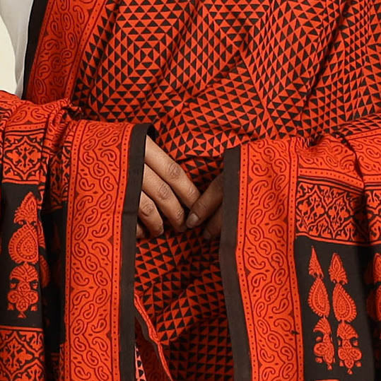 Embrace timeless artistry with this exquisite orange mul cotton bagh block print dupatta, skillfully crafted by master artisan Umar Faruk Khatri. Originating from the culturally rich Dhar district of Madhya Pradesh, this dupatta carries the legacy of bagh block printing, celebrated for its intricate motifs and deep, natural hues. The breathable mul cotton ensures effortless draping, making it a versatile addition to your wardrobe.