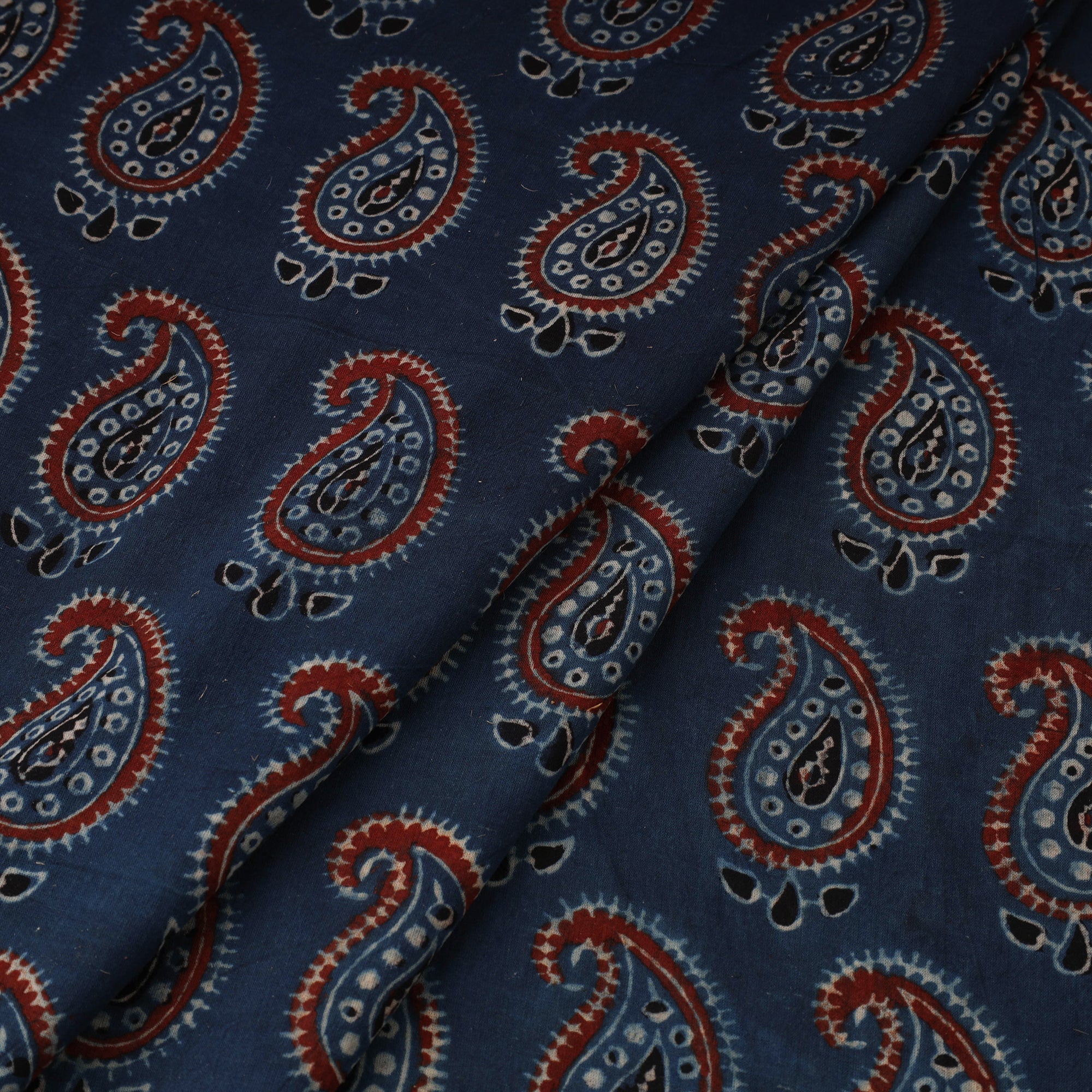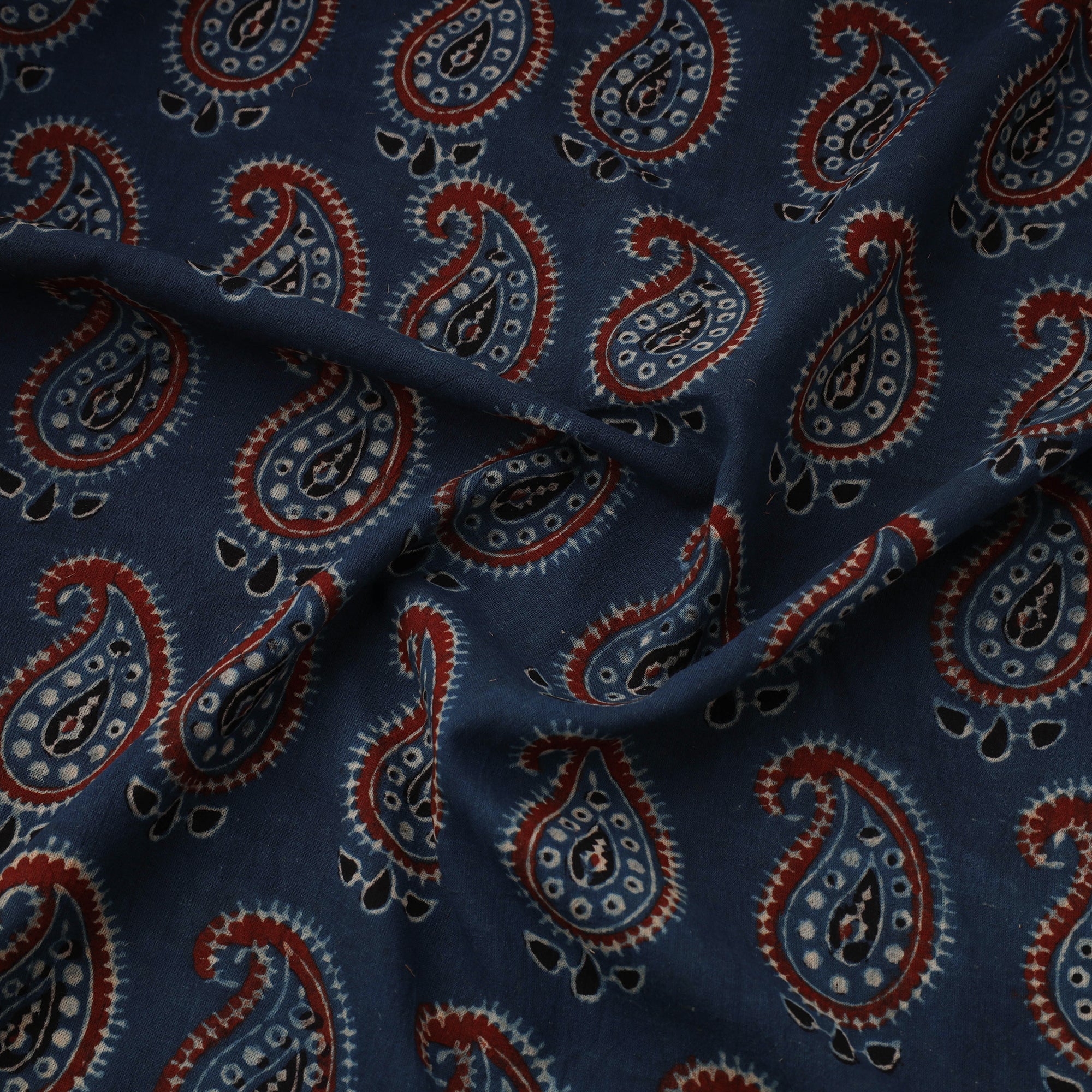 This 3 kaam blue ajrakh cotton fabric from Kutch, Gujarat, crafted with natural dyes and rooted in a centuries-old resist-based hand block printing tradition. This fabric showcases layered designs created using three intricately carved blocks. Ajrakh is admired for its earthy palette and intricate motifs, ideal for kurtas, dresses, or decor.
