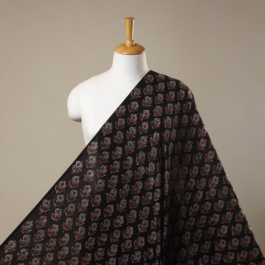 This 3 kaam black ajrakh cotton fabric from Kutch, Gujarat, crafted with natural dyes and rooted in a centuries-old resist-based hand block printing tradition. This fabric showcases layered designs created using three intricately carved blocks. Ajrakh is admired for its earthy palette and intricate motifs, ideal for kurtas, dresses, or decor.