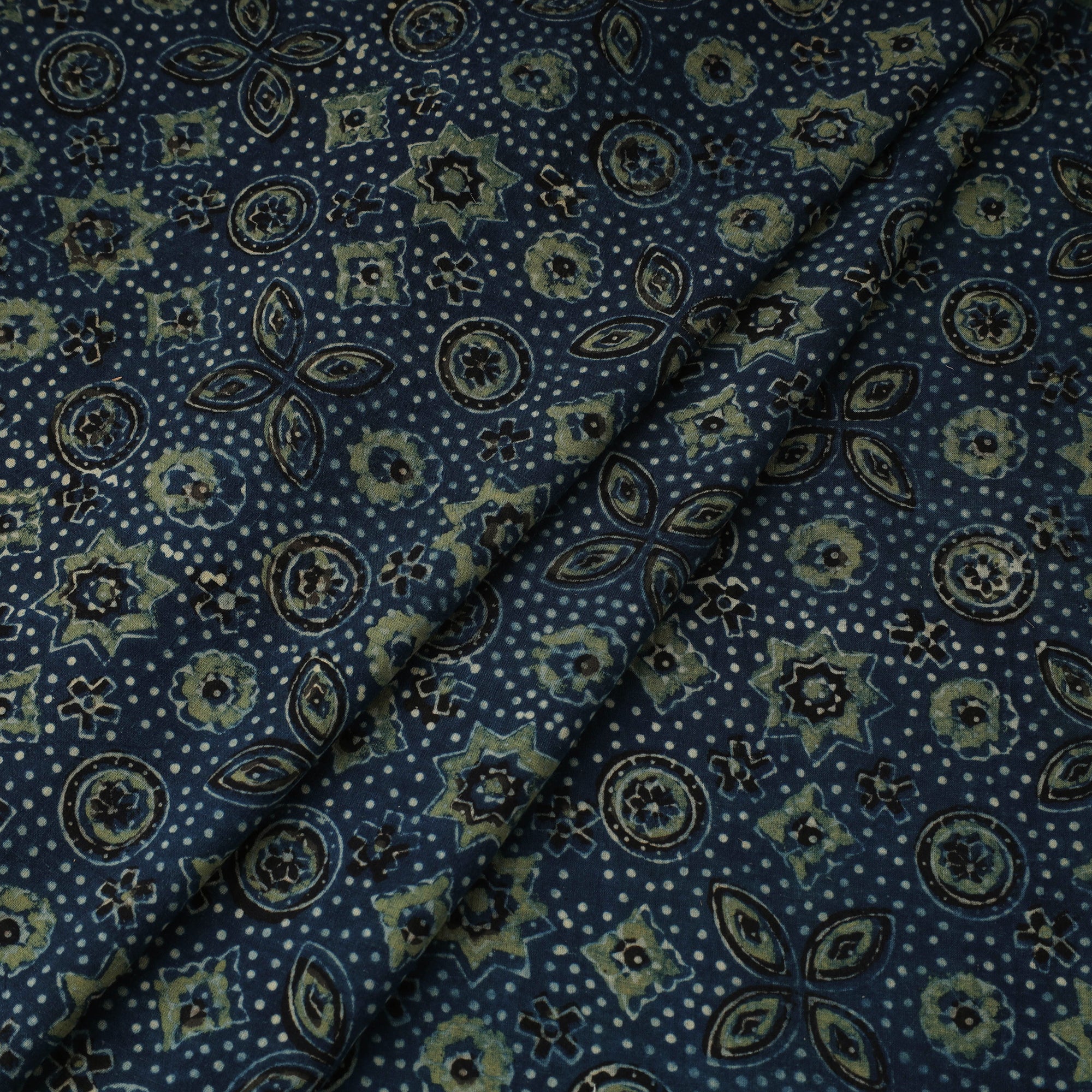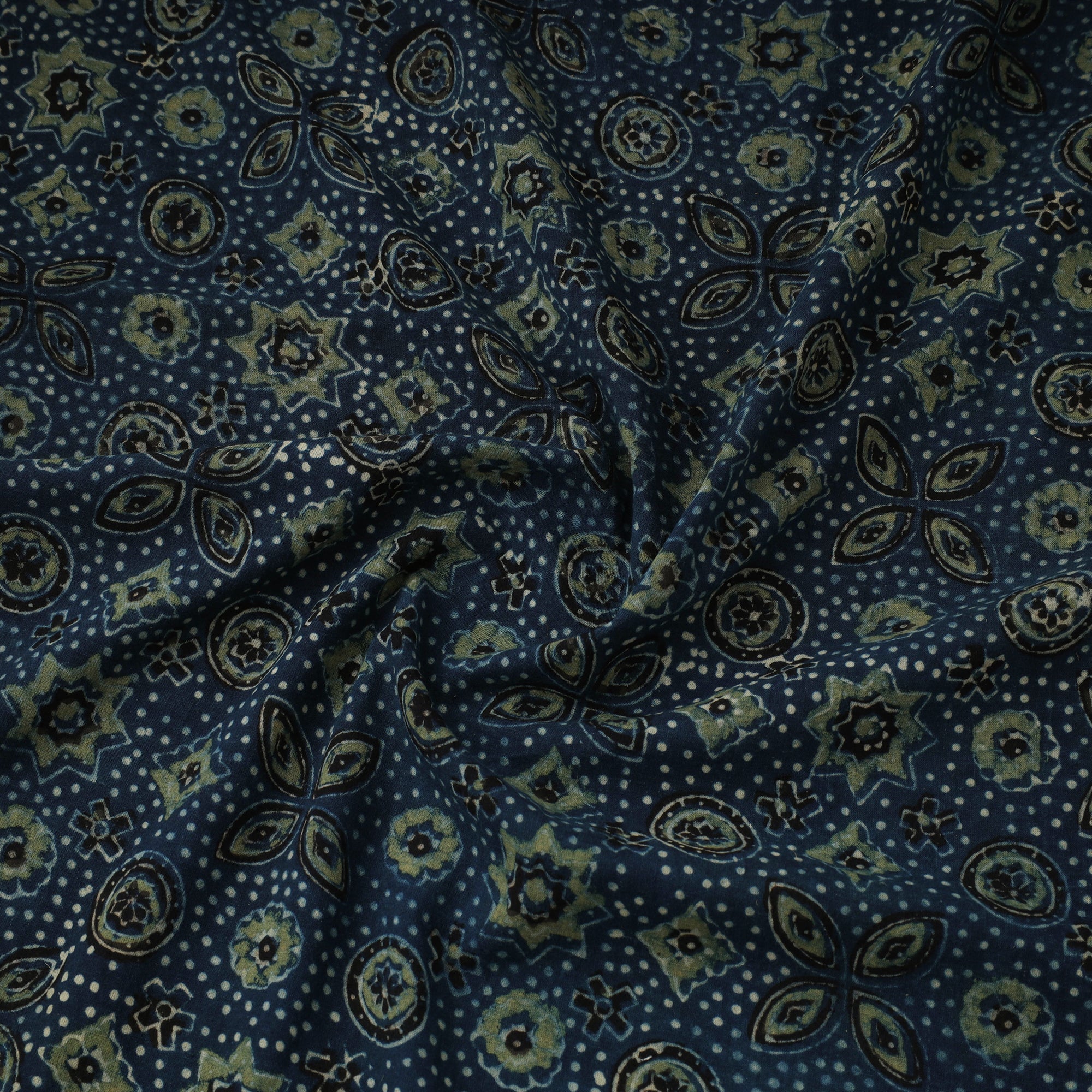 This 3 kaam blue ajrakh cotton fabric from Kutch, Gujarat, crafted with natural dyes and rooted in a centuries-old resist-based hand block printing tradition. This fabric showcases layered designs created using three intricately carved blocks. Ajrakh is admired for its earthy palette and intricate motifs, ideal for kurtas, dresses, or decor.