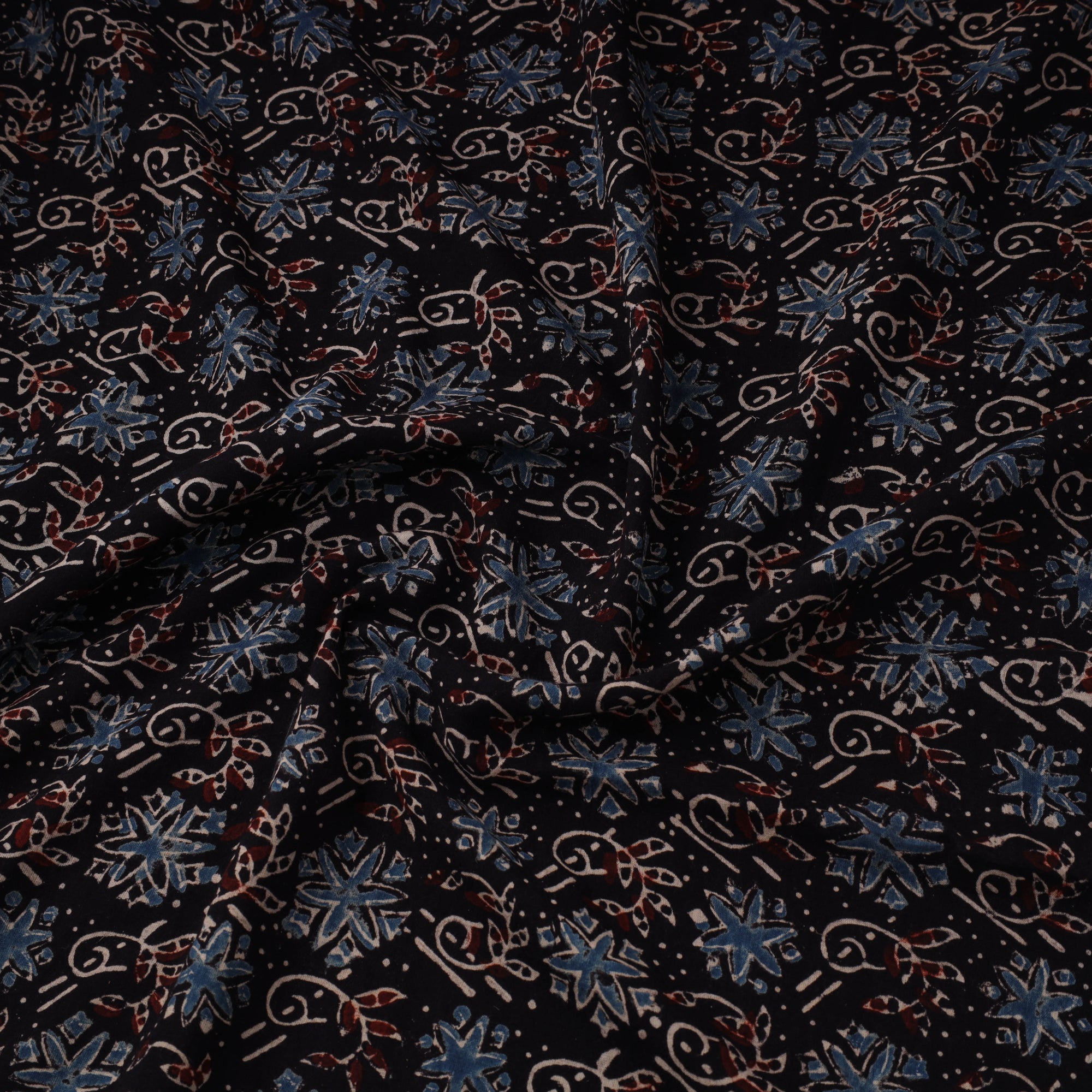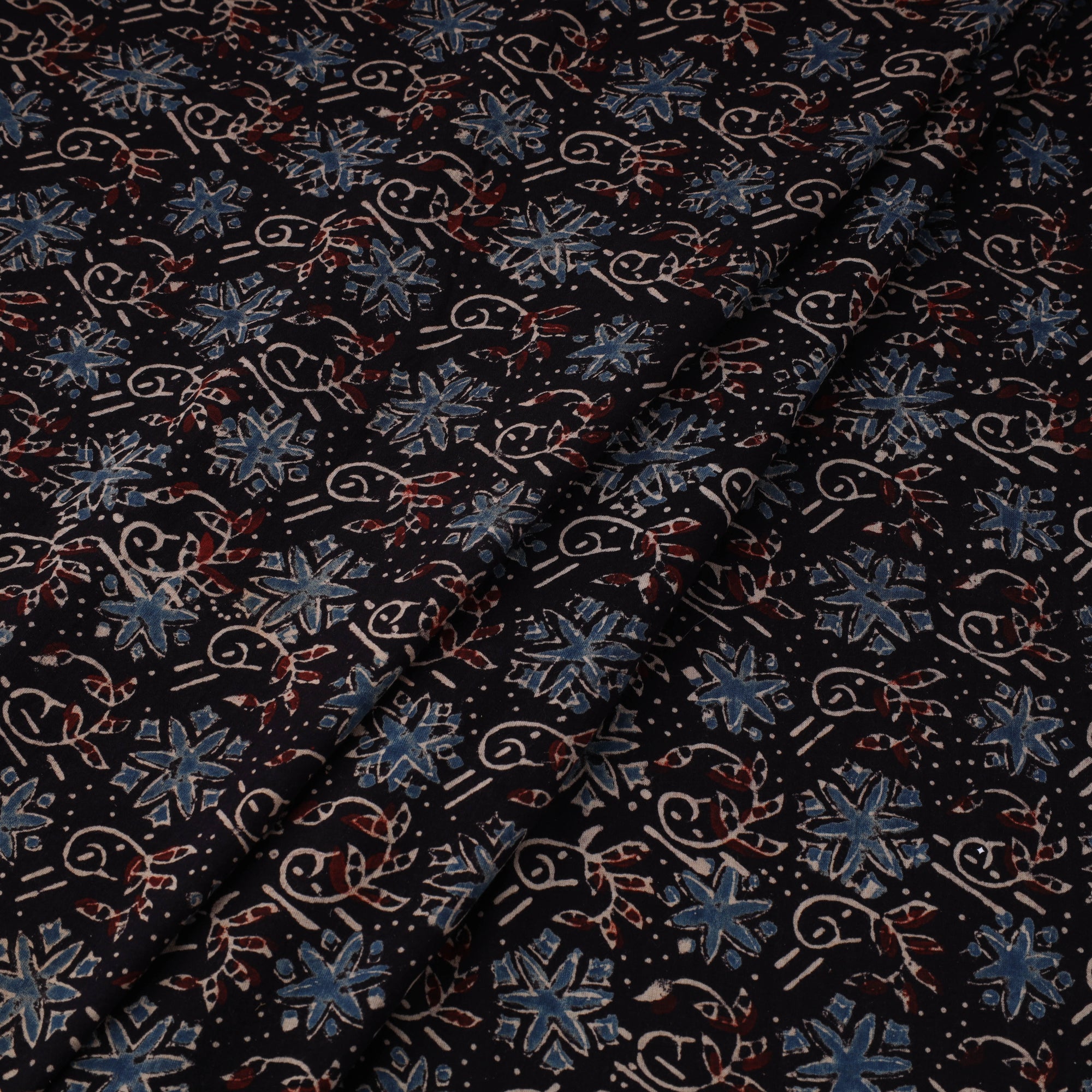 This 3 kaam black ajrakh cotton fabric from Kutch, Gujarat, crafted with natural dyes and rooted in a centuries-old resist-based hand block printing tradition. This fabric showcases layered designs created using three intricately carved blocks. Ajrakh is admired for its earthy palette and intricate motifs, ideal for kurtas, dresses, or decor.