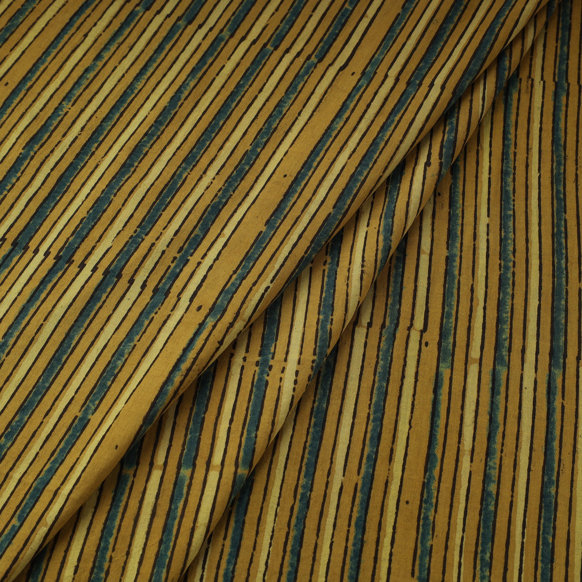 This 3 kaam yellow ajrakh cotton fabric from Kutch, Gujarat, crafted with natural dyes and rooted in a centuries-old resist-based hand block printing tradition. This fabric showcases layered designs created using three intricately carved blocks. Ajrakh is admired for its earthy palette and intricate motifs, ideal for kurtas, dresses, or decor.