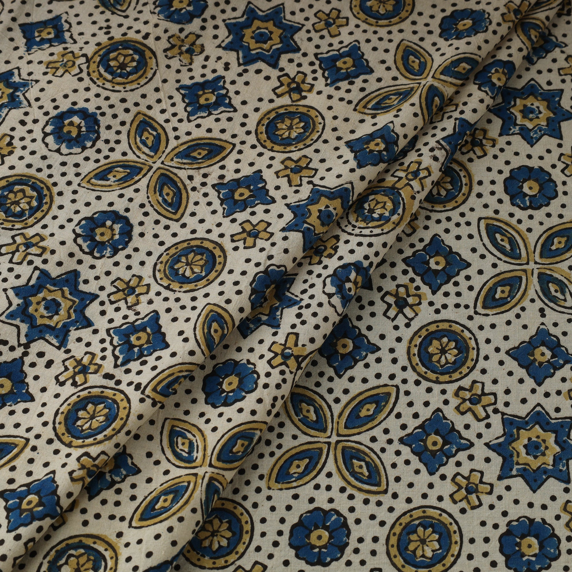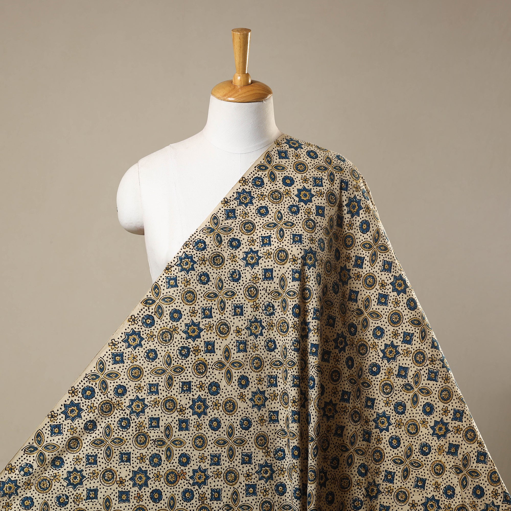 This 3 kaam beige ajrakh cotton fabric from Kutch, Gujarat, crafted with natural dyes and rooted in a centuries-old resist-based hand block printing tradition. This fabric showcases layered designs created using three intricately carved blocks. Ajrakh is admired for its earthy palette and intricate motifs, ideal for kurtas, dresses, or decor.