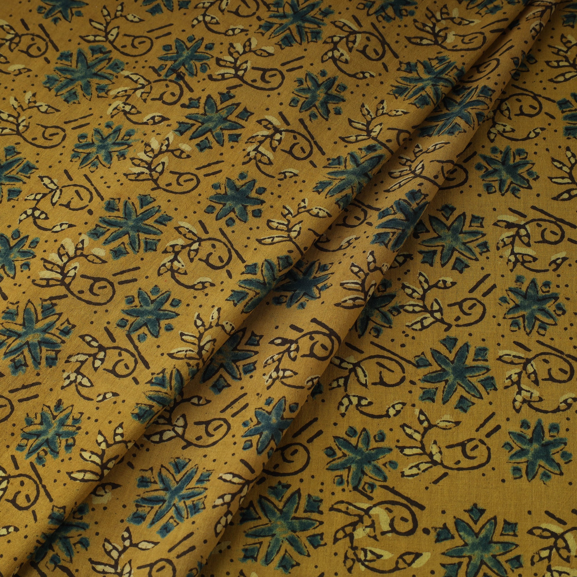 This 3 kaam yellow ajrakh cotton fabric from Kutch, Gujarat, crafted with natural dyes and rooted in a centuries-old resist-based hand block printing tradition. This fabric showcases layered designs created using three intricately carved blocks. Ajrakh is admired for its earthy palette and intricate motifs, ideal for kurtas, dresses, or decor.