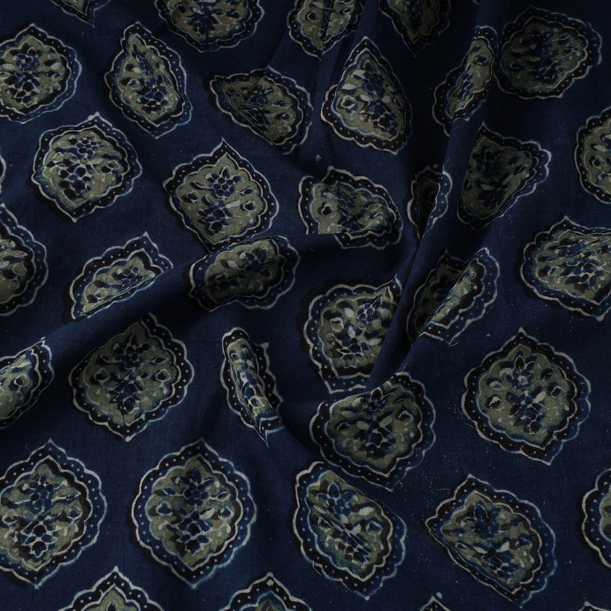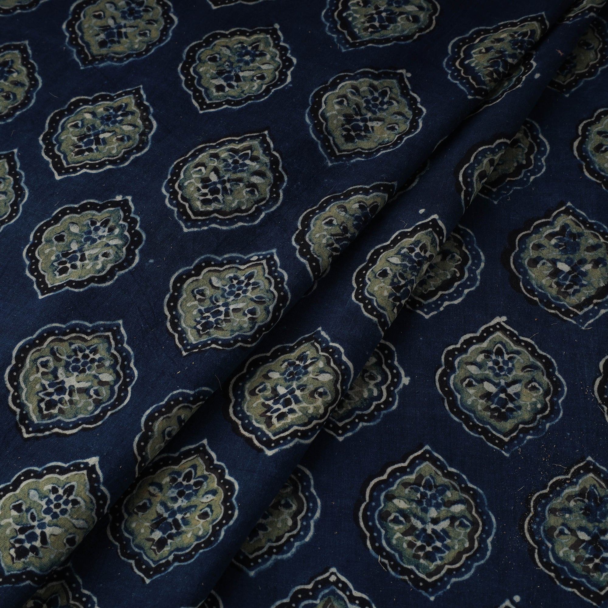 This 3 kaam blue ajrakh cotton fabric from Kutch, Gujarat, crafted with natural dyes and rooted in a centuries-old resist-based hand block printing tradition. This fabric showcases layered designs created using three intricately carved blocks. Ajrakh is admired for its earthy palette and intricate motifs, ideal for kurtas, dresses, or decor.