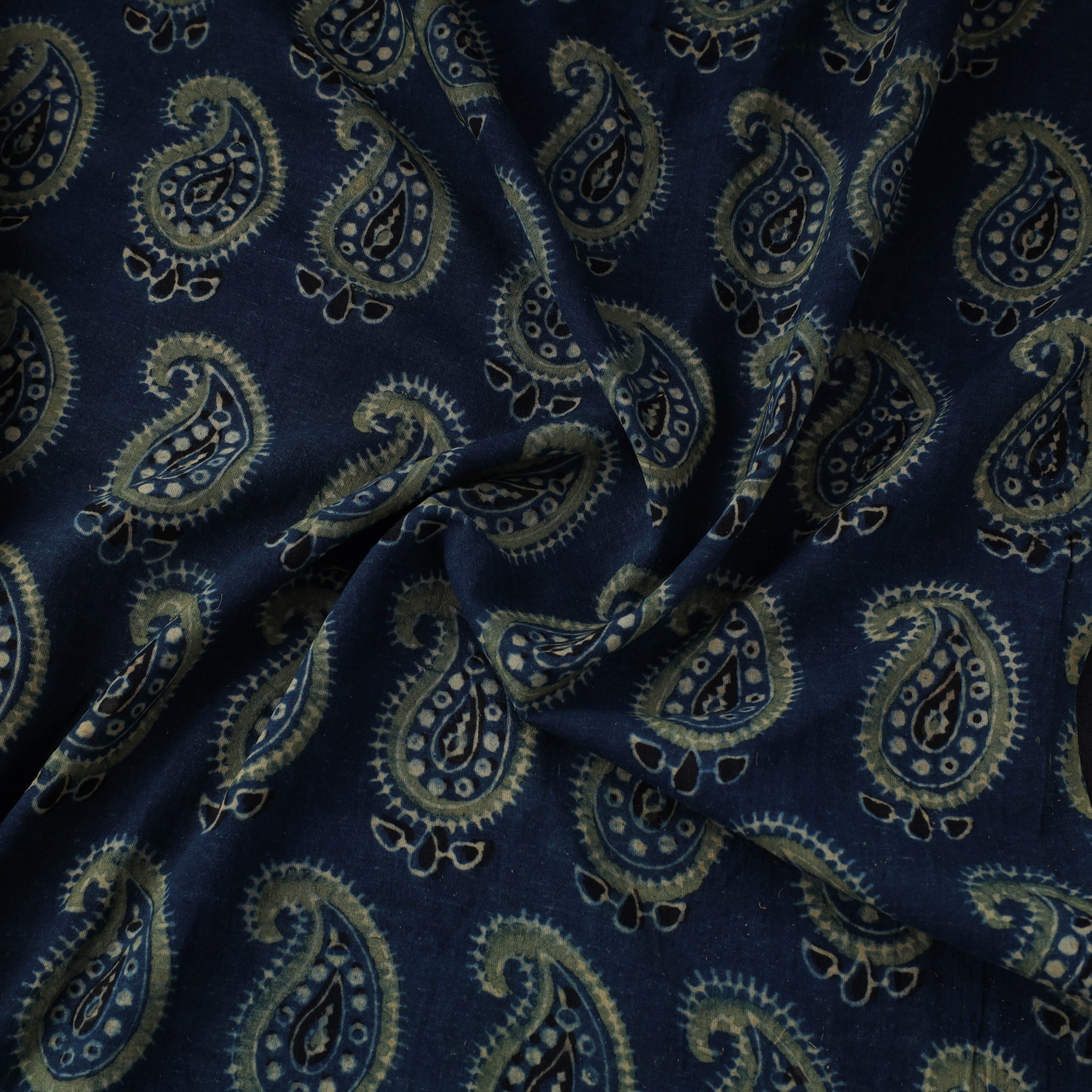 This 3 kaam blue ajrakh cotton fabric from Kutch, Gujarat, crafted with natural dyes and rooted in a centuries-old resist-based hand block printing tradition. This fabric showcases layered designs created using three intricately carved blocks. Ajrakh is admired for its earthy palette and intricate motifs, ideal for kurtas, dresses, or decor.