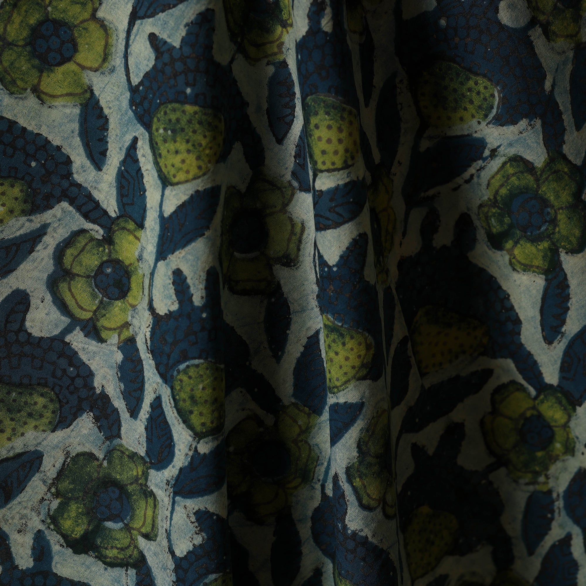 This fine-quality blue bagru dabu hand block-printed cotton fabric is crafted using natural dyes and traditional resist-printing techniques from the Bagru region of Rajasthan. It celebrates the timeless legacy of Indian textile artistry and is ideal for making graceful kurtas, airy dresses, or elegant home accents.