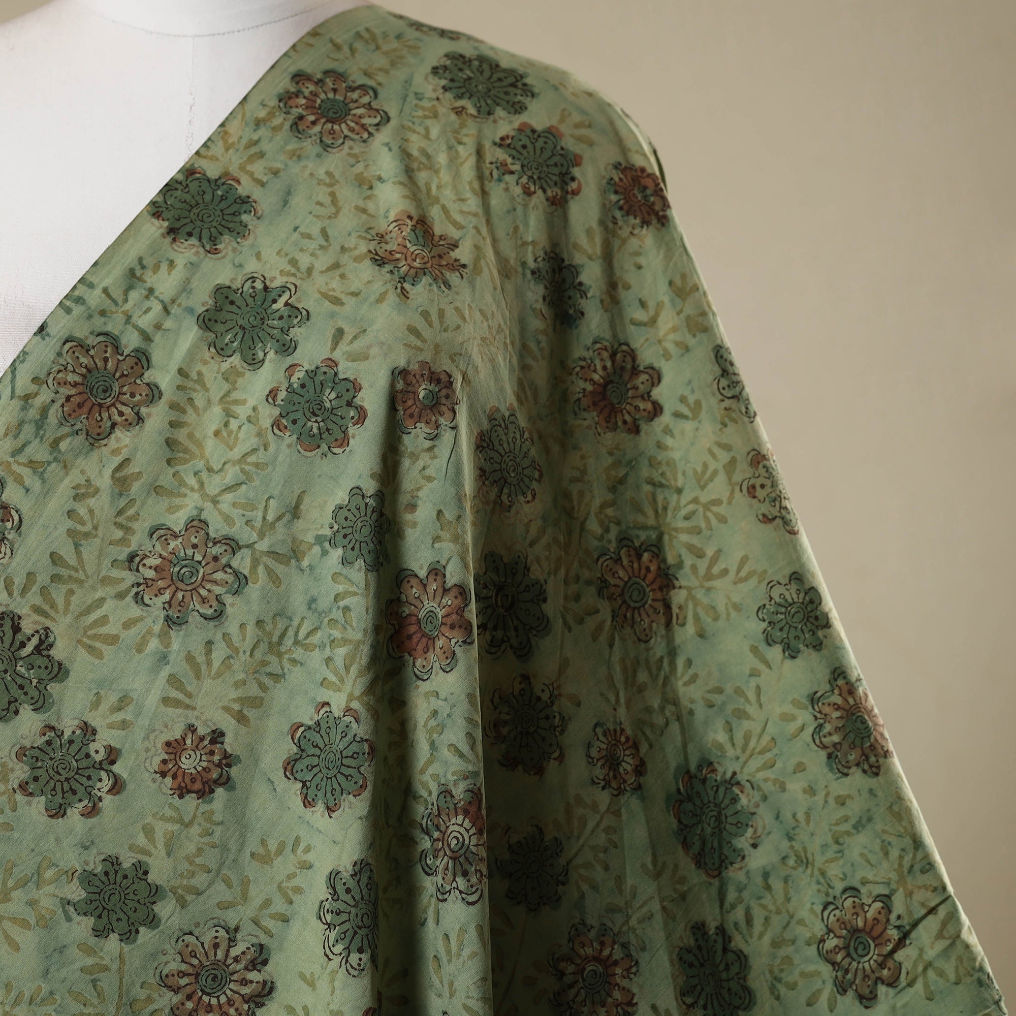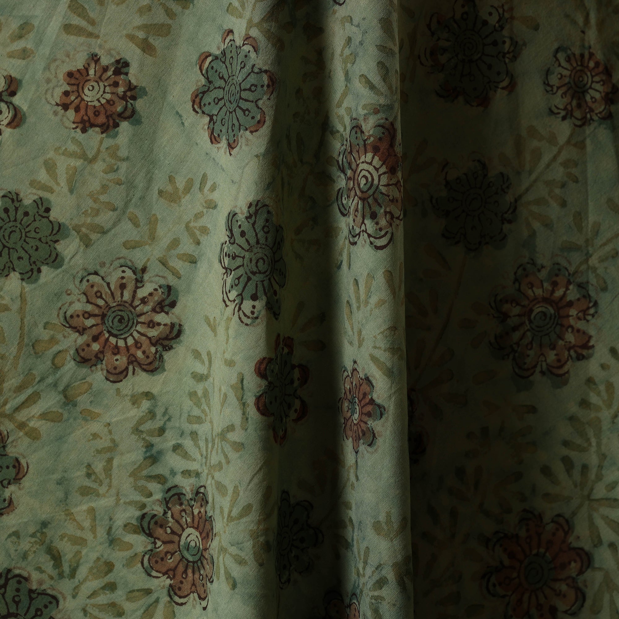 This fine-quality green bagru dabu hand block-printed cotton fabric is crafted using natural dyes and traditional resist-printing techniques from the Bagru region of Rajasthan. It celebrates the timeless legacy of Indian textile artistry and is ideal for making graceful kurtas, airy dresses, or elegant home accents.