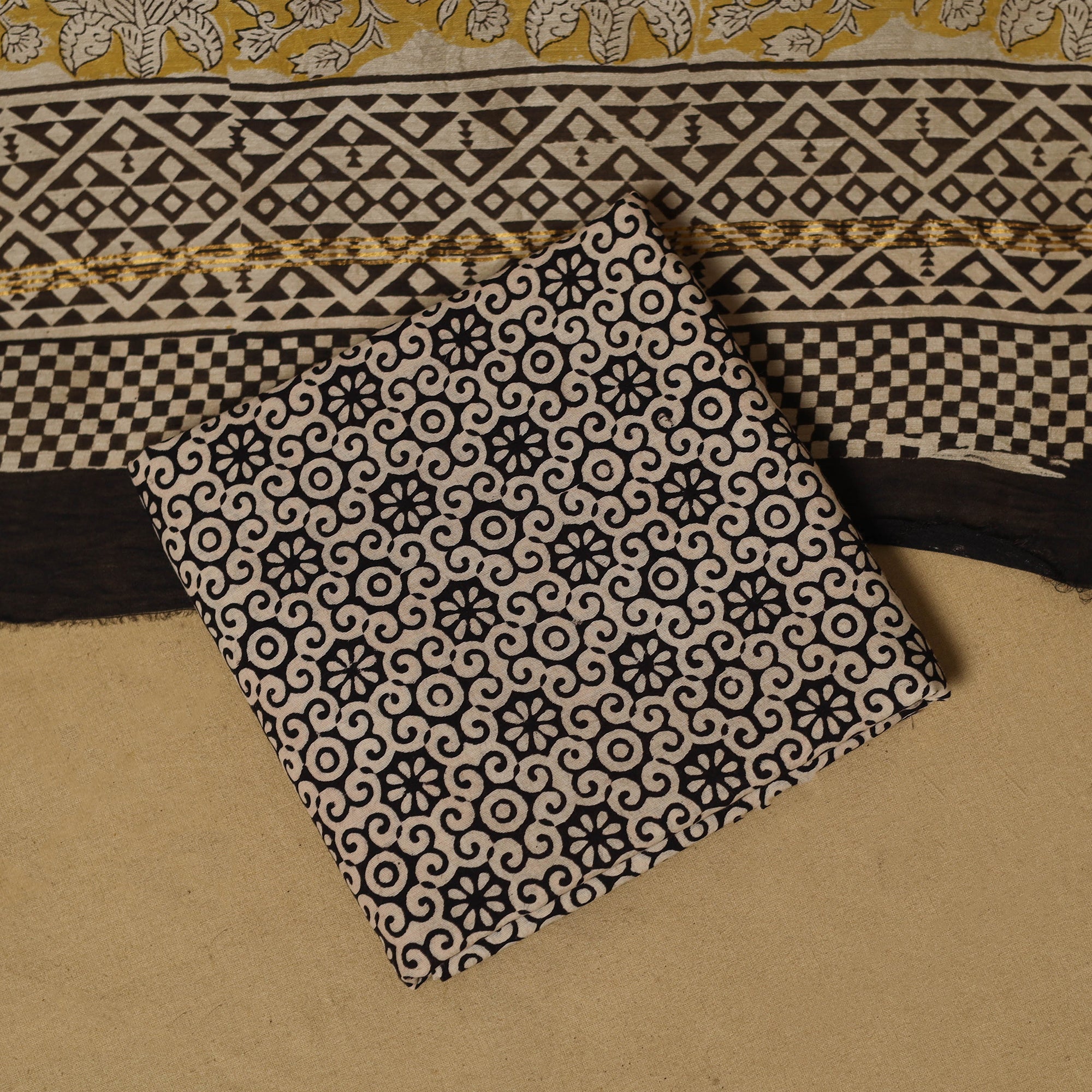 Bagru chanderi silk cotton 3pc unstitched dress material highlights traditional hand block printing done using the mud-resist technique. Crafted by skilled artisans from Bagru, Rajasthan, the set features a chanderi silk cotton kurta fabric with a matching dupatta, paired with a cotton bottom. Its balanced blend of texture and design makes it suitable for festive occasions as well as refined everyday wear.