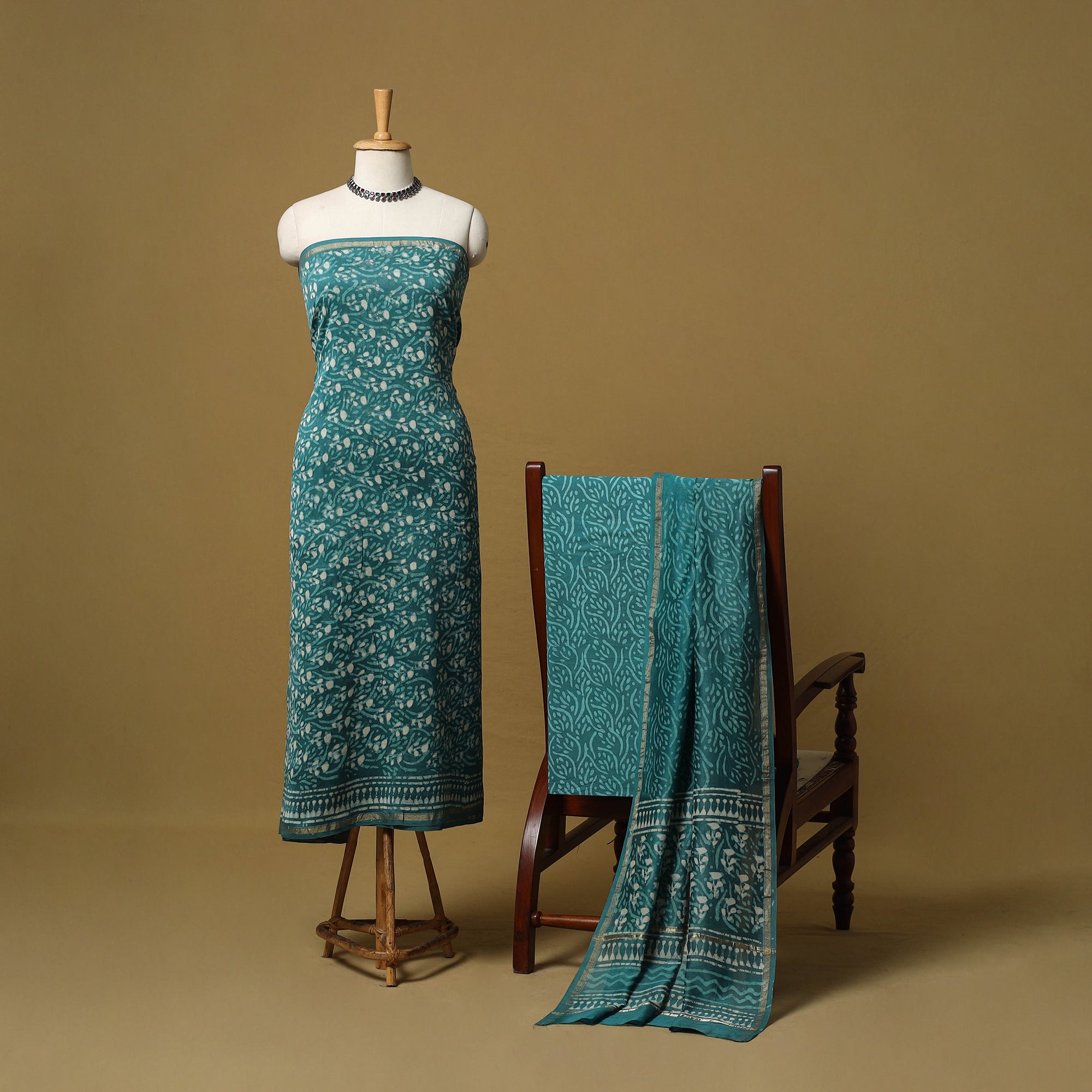 Bagru chanderi silk cotton 3pc unstitched dress material highlights traditional hand block printing done using the mud-resist technique. Crafted by skilled artisans from Bagru, Rajasthan, the set features a chanderi silk cotton kurta fabric with a matching dupatta, paired with a cotton bottom. Its balanced blend of texture and design makes it suitable for festive occasions as well as refined everyday wear.