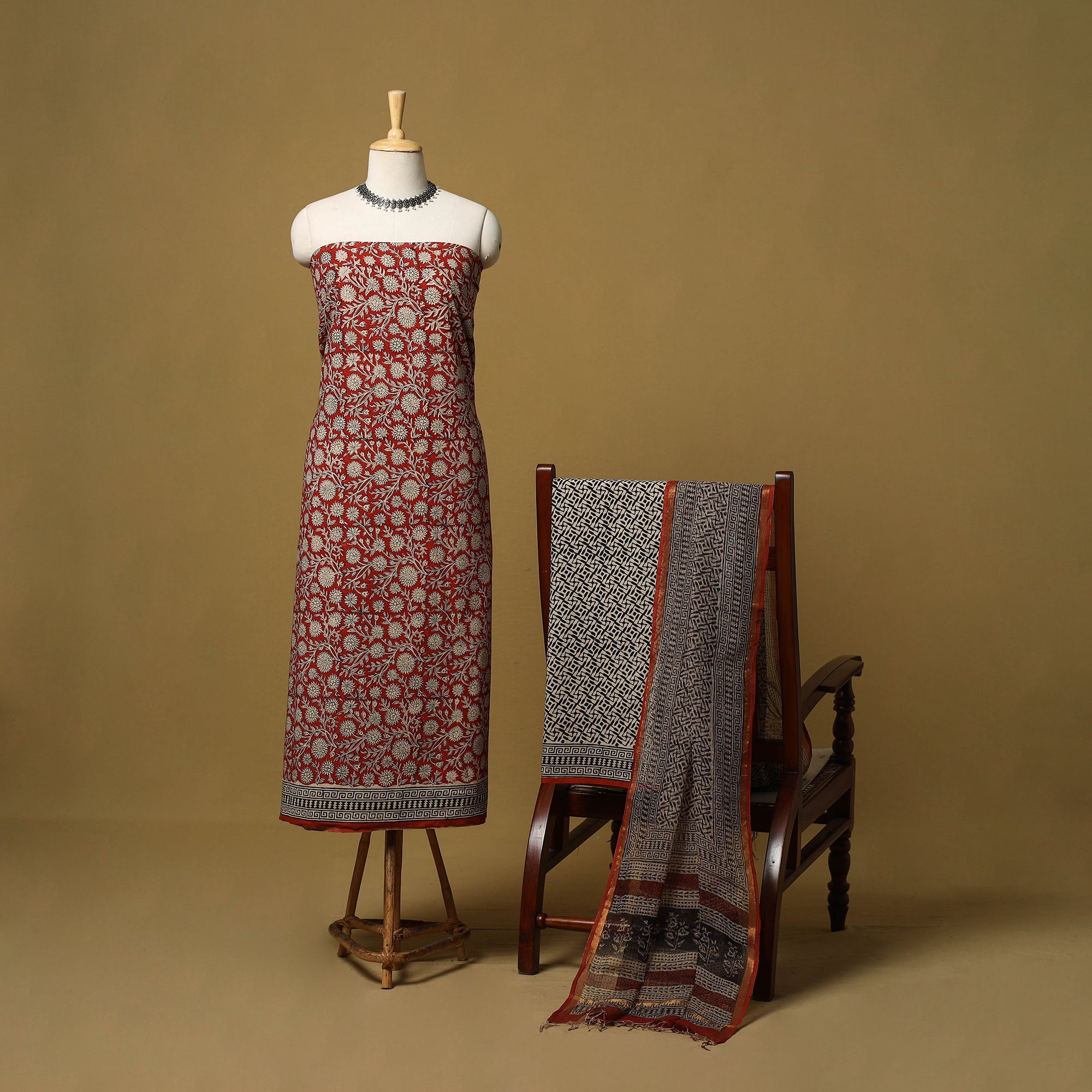 Bagru 3pc unstitched dress material showcases the beauty of hand block printing using the traditional mud-resist technique, crafted by skilled artisans from Bagru, Rajasthan. Dyed with natural colours, the cotton set includes fabric for the kurta and bottom, along with a lightweight kota doria dupatta featuring a zari border perfect for both festive occasions and everyday elegance.