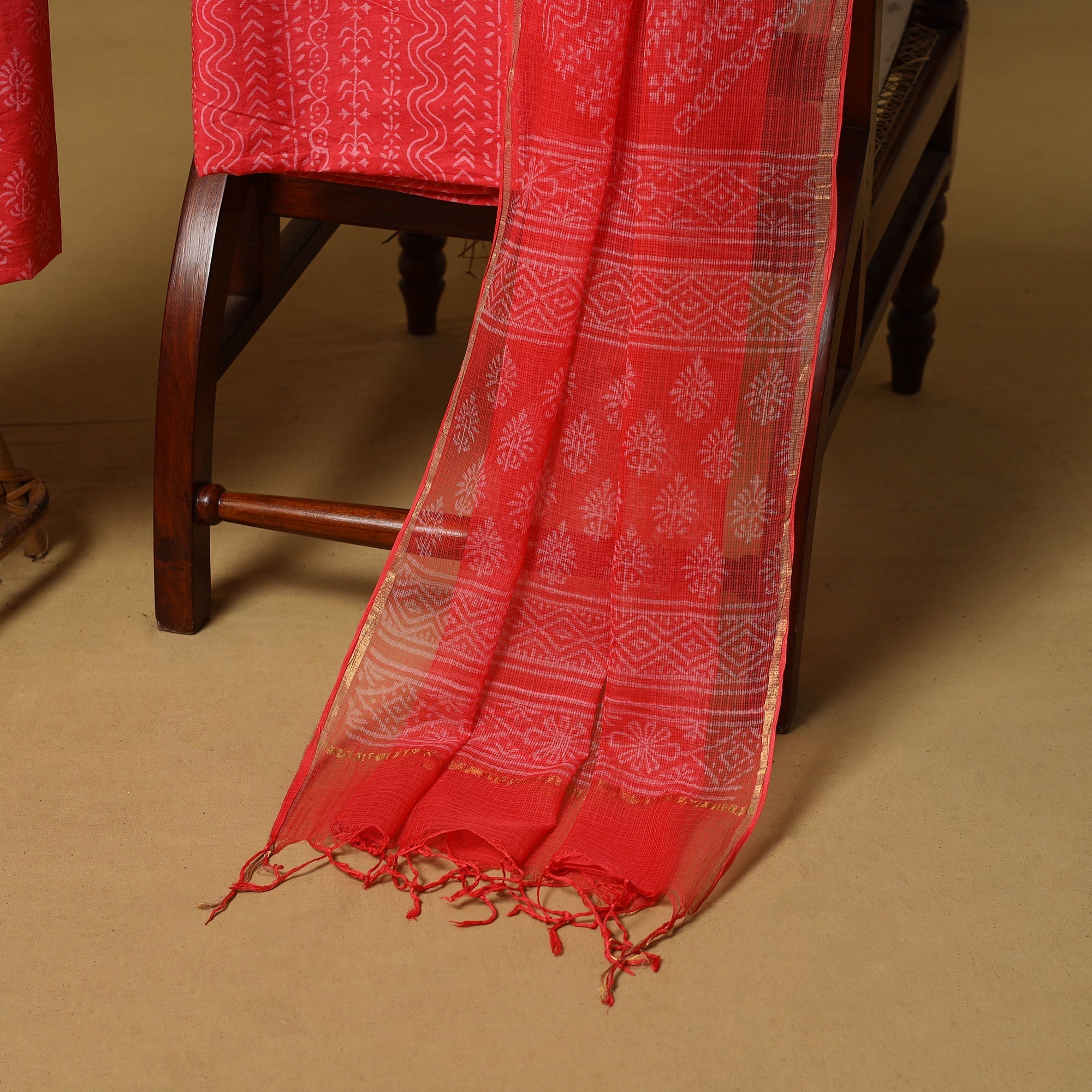 Pink bagru 3pc unstitched dress material showcases the beauty of hand block printing using the traditional mud-resist technique, crafted by skilled artisans from Bagru, Rajasthan. Dyed with natural colours, the cotton set includes fabric for the kurta and bottom, along with a lightweight kota doria dupatta featuring a zari border perfect for both festive occasions and everyday elegance.