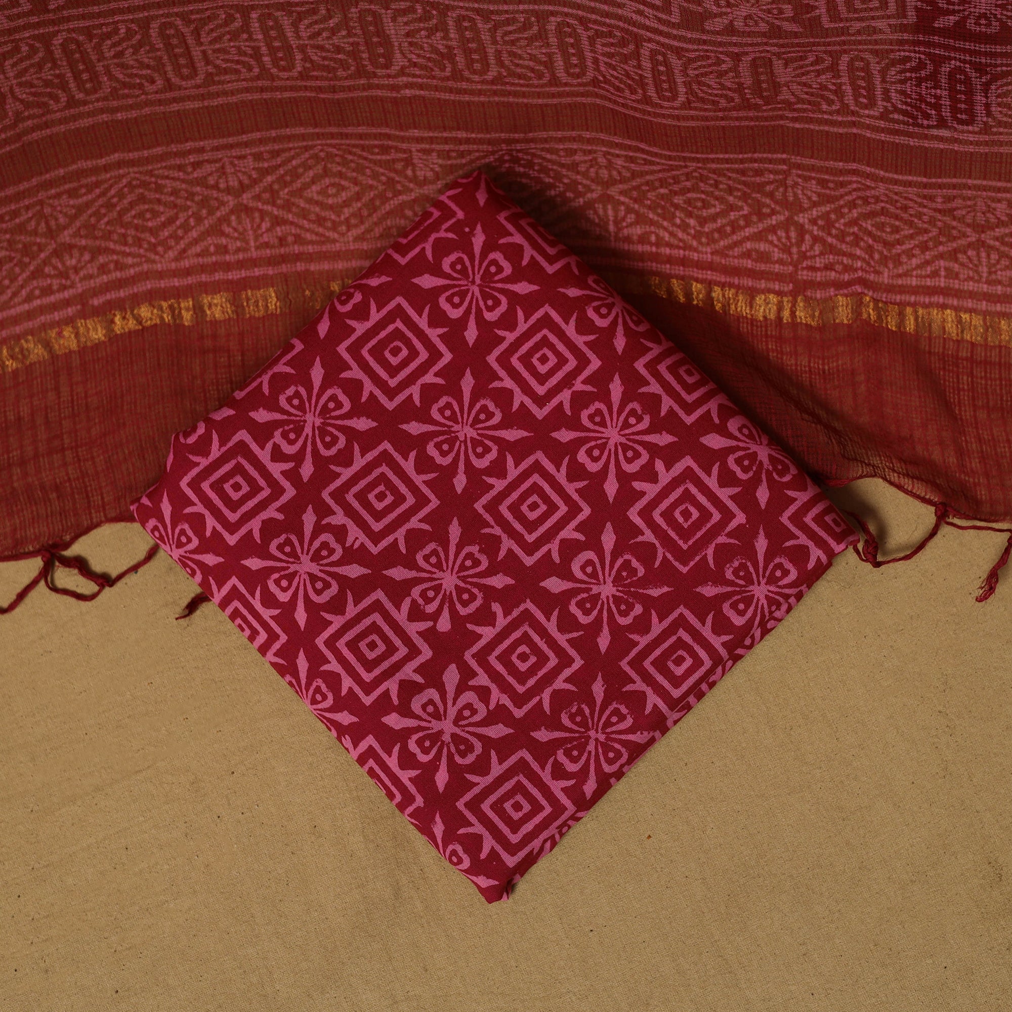 Red bagru 3pc unstitched dress material showcases the beauty of hand block printing using the traditional mud-resist technique, crafted by skilled artisans from Bagru, Rajasthan. Dyed with natural colours, the cotton set includes fabric for the kurta and bottom, along with a lightweight kota doria dupatta featuring a zari border perfect for both festive occasions and everyday elegance.