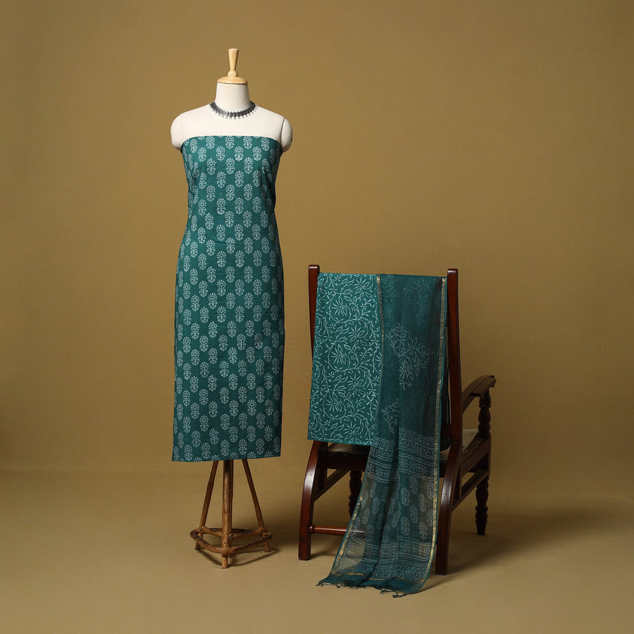 Bagru 3pc unstitched dress material showcases the beauty of hand block printing using the traditional mud-resist technique, crafted by skilled artisans from Bagru, Rajasthan. Dyed with natural colours, the cotton set includes fabric for the kurta and bottom, along with a lightweight kota doria dupatta featuring a zari border perfect for both festive occasions and everyday elegance.