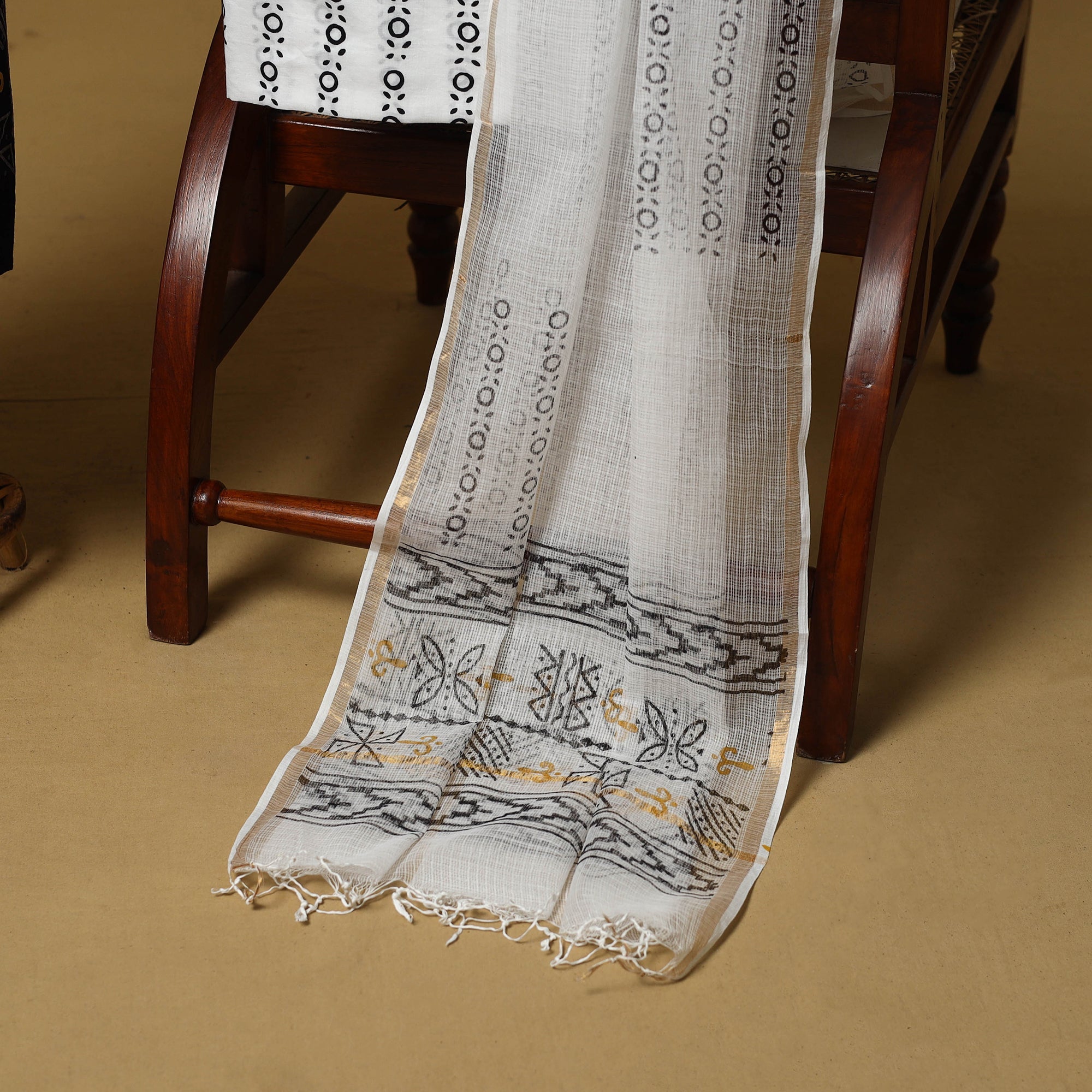 Bagru 3pc unstitched dress material showcases the beauty of hand block printing using the traditional mud-resist technique, crafted by skilled artisans from Bagru, Rajasthan. Dyed with natural colours, the cotton set includes fabric for the kurta and bottom, along with a lightweight kota doria dupatta featuring a zari border perfect for both festive occasions and everyday elegance.