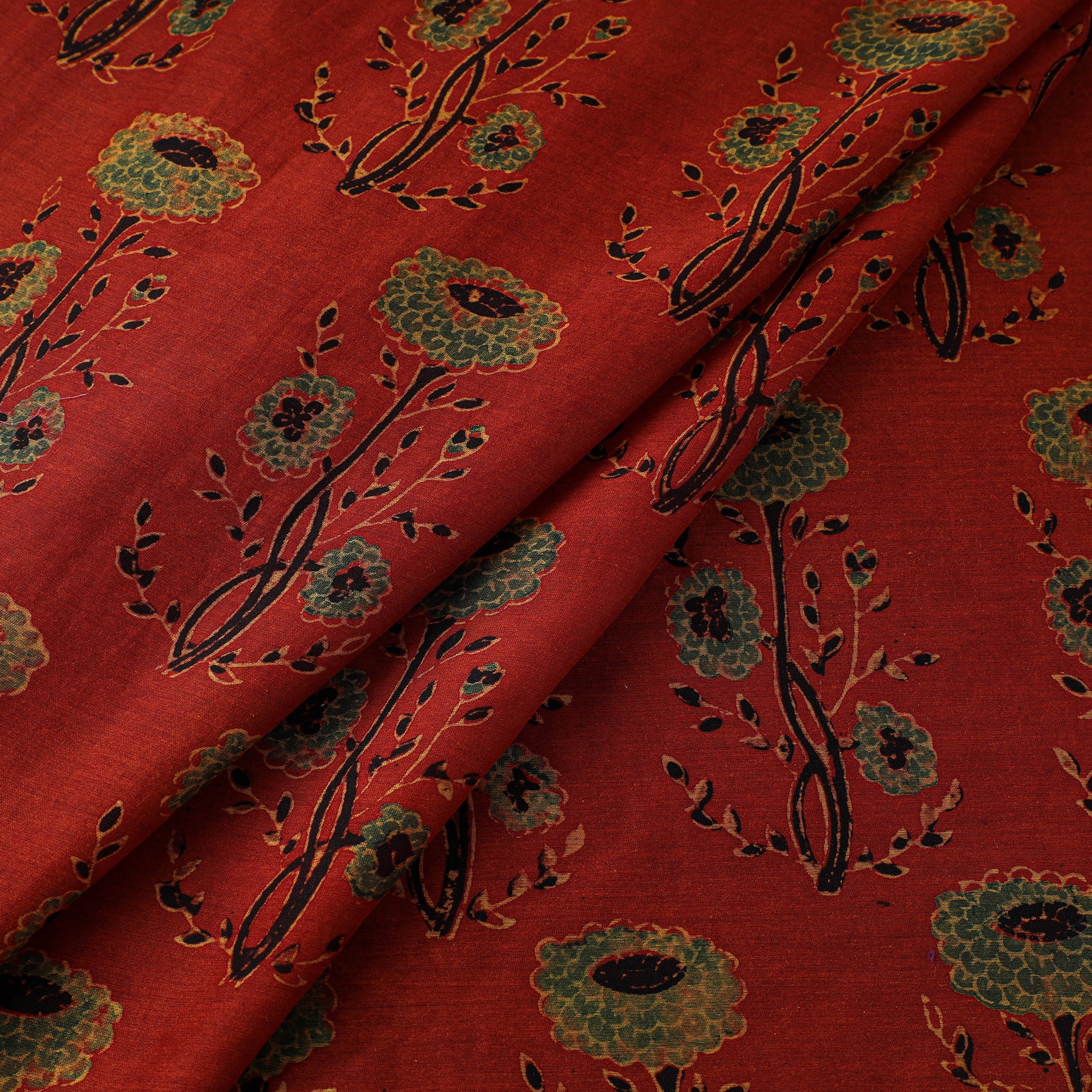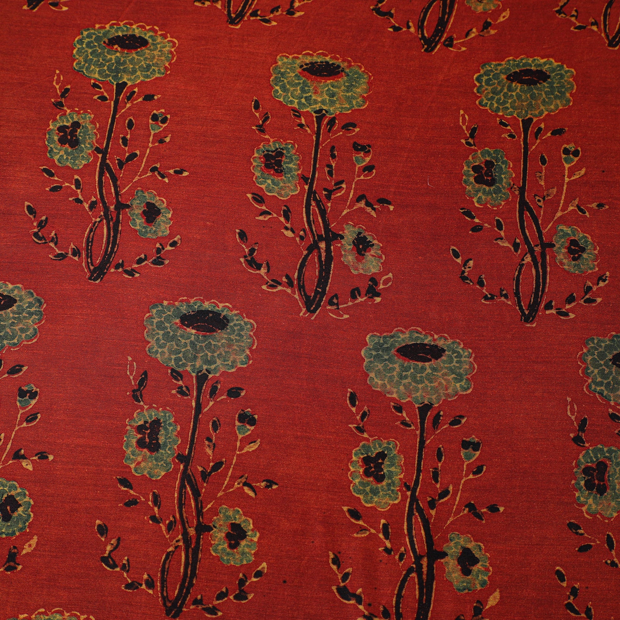 Red ajrakh fabric is hand block-printed in Kutch using natural dyes and age-old techniques passed down through generations. Crafted with precision, each motif reflects Gujarat’s rich textile heritage. Made of chanderi silk and mercerized cotton blend, it's ideal for creating kurtas, shirts, dresses, or even elegant home decor accents.